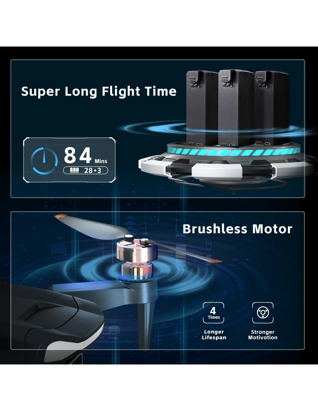 - Potenti motori brushless Dotato di tre batterie aggiornate per fornire fino a 84 minuti di tempo di volo, lascia che il tuo drone nuoti liberamente nel cielo.