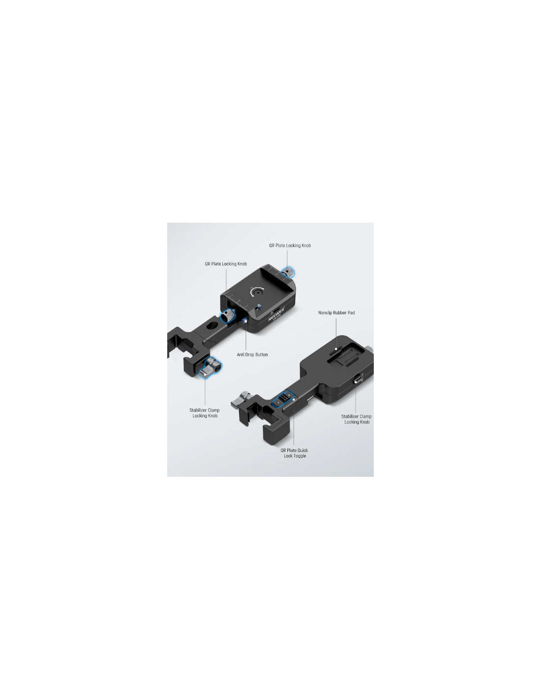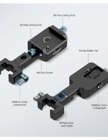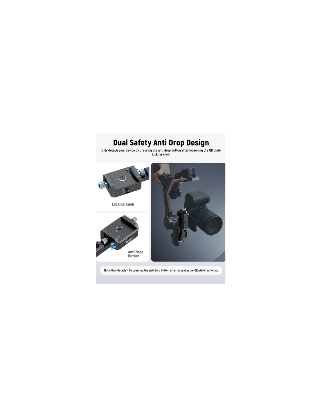 Design anticaduta a doppia sicurezza: fissa la tua fotocamera o altri dispositivi allo stabilizzatore con due manopole di serraggio per la piastra a sgancio rapido e il morsetto dello stabilizzatore, e un blocco a levetta per la base a sgancio rapido girevole a 180°. Il design a doppia sicurezza mantiene il dispositivo al sicuro, poiché è possibile rimuoverlo solo premendo il pulsante anti-caduta dopo aver allentato la manopola di serraggio della piastra a sgancio rapido.