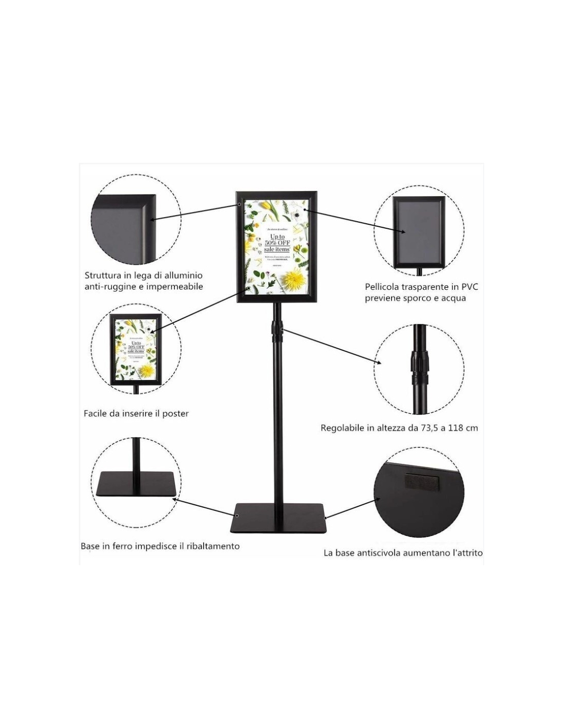 Questo stand informativo semplice e pratico è la scelta ideale per la visualizzazione e la pubblicità in luoghi pubblici. Con telaio in alluminio e supporto in acciaio inossidabile, che è durevole e solido. Ora è facile e poco costoso pubblicizzare le Sue promozioni o offerte con questo stand di presentazione.