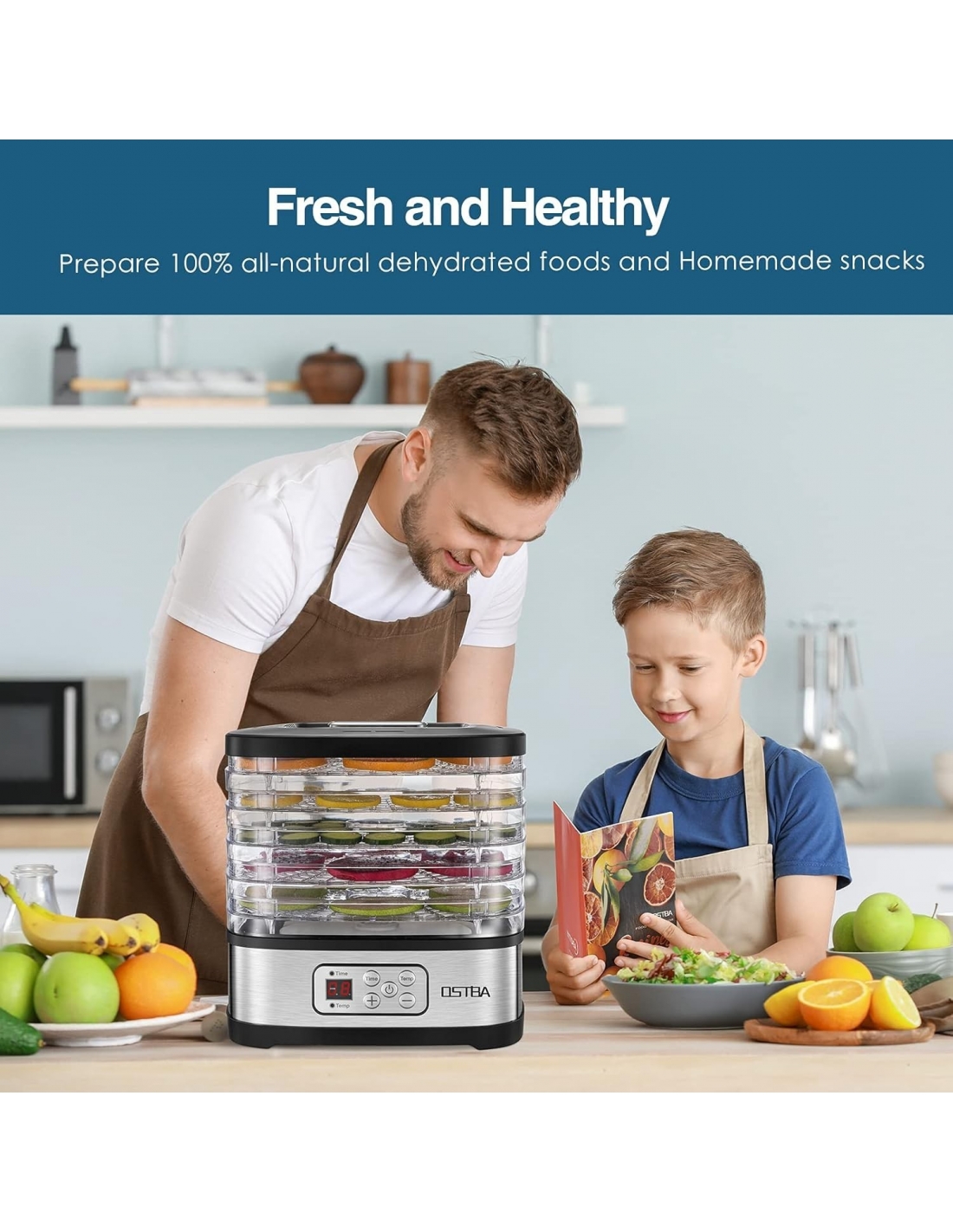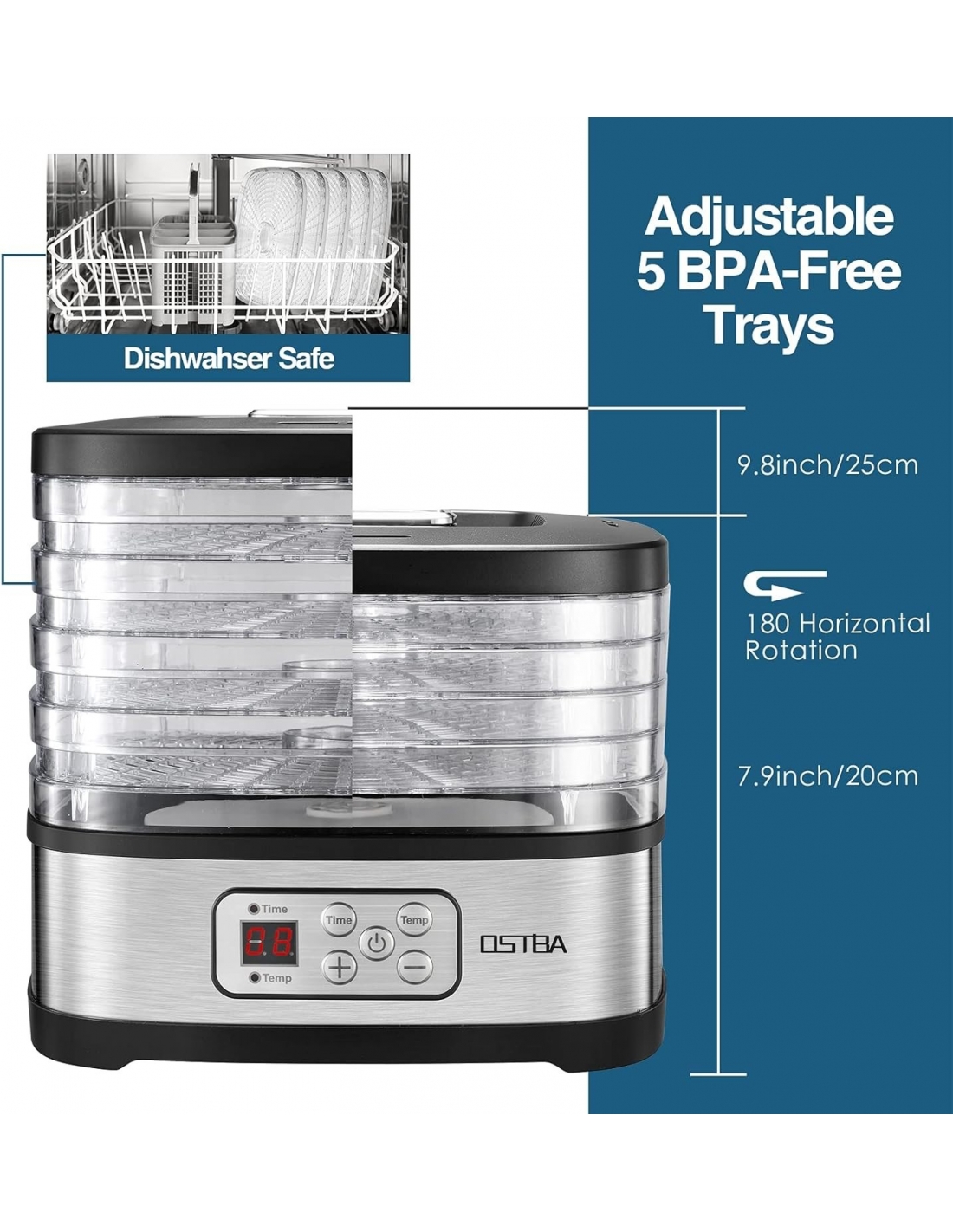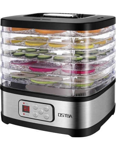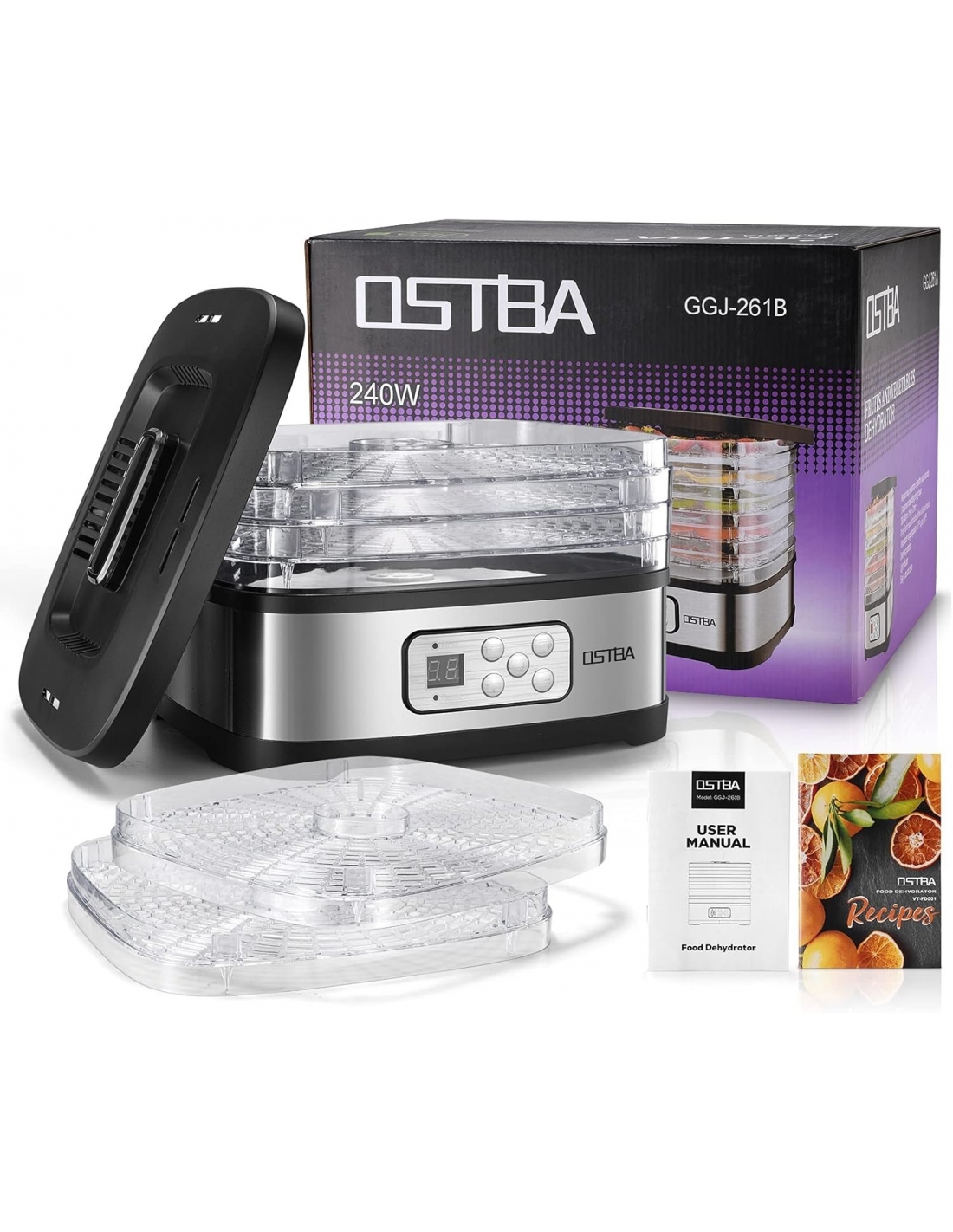 OSTBA GGJ-261B Essiccatore per alimenti con temperatura regolabile e timer da 72 ore, essiccatore a 5 vassoi per alimenti e carne secca, frutta, snack per cani, erbe aromatiche, snack, display a LED, essiccatore elettrico per alimenti da 240 W, libro di ricette