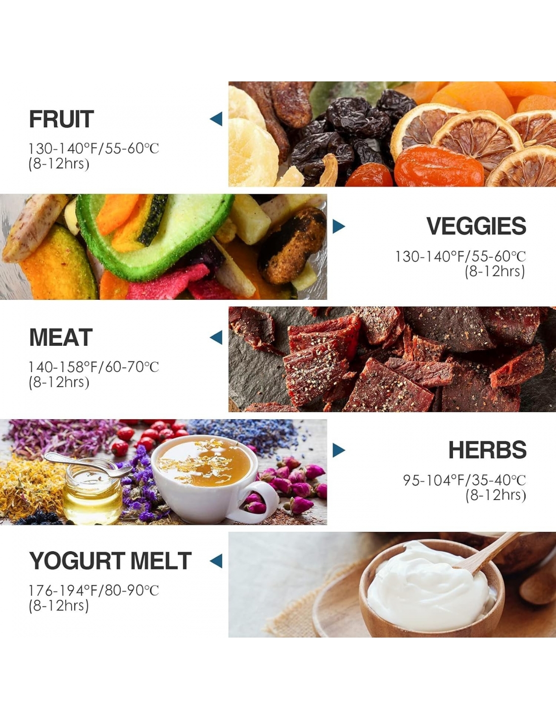 - Varie scelte alimentari e conservazione: la disidratazione degli alimenti è un metodo di conservazione collaudato. L'essiccatore per alimenti disidrata carne secca e frutta per la tua famiglia, produce snack per cani sani ed economici, erbe aromatiche essiccate per la conservazione.