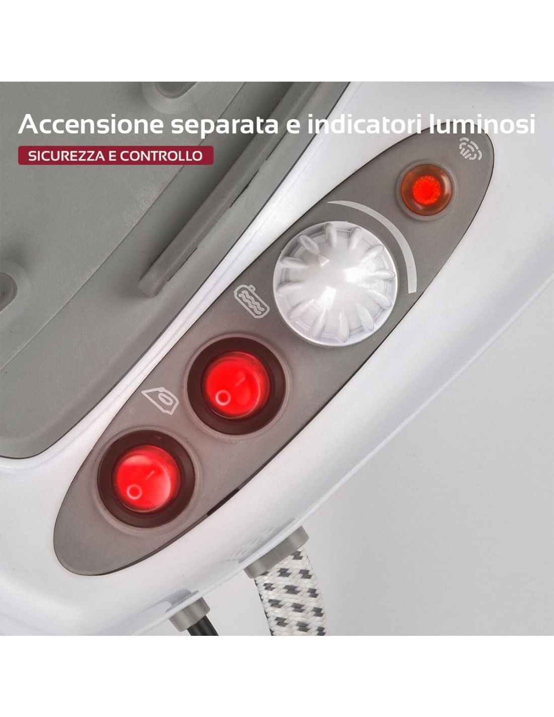 - Serbatoio con capacità di 700cc e pressione d’esercizio di 2,5-3 Bar, con accensione separata per ferro e caldaia e indicatori luminosi di funzionamento.