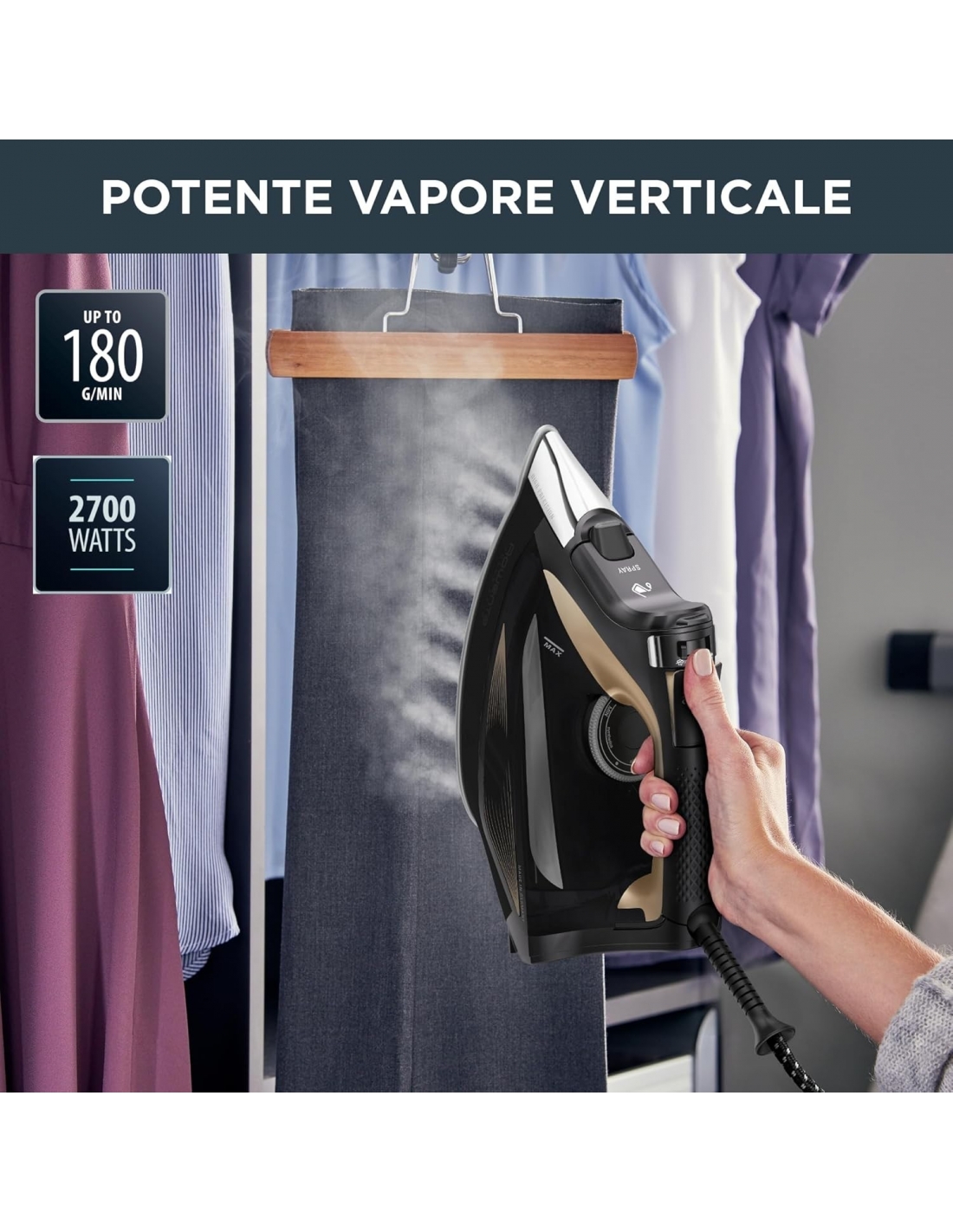 - STIRO VERTICALE: L'erogazione del vapore su capi delicati e di grandi dimensioni è facilitata dalla funzione vapore verticale, ideale per rimuovere le pieghe dai completi o da altri capi appesi, incluse le tende