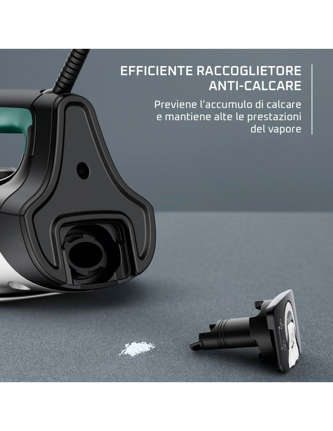 - RACCOGLITORE EFFICIENTE ANTI CALCARE: Il sistema anticalcare previene l’accumulo di calcare e contribuisce a mantenere un alto livello di vapore nel corso del tempo. Consente una manutenzione semplice e una pulizia facile nel tempo.