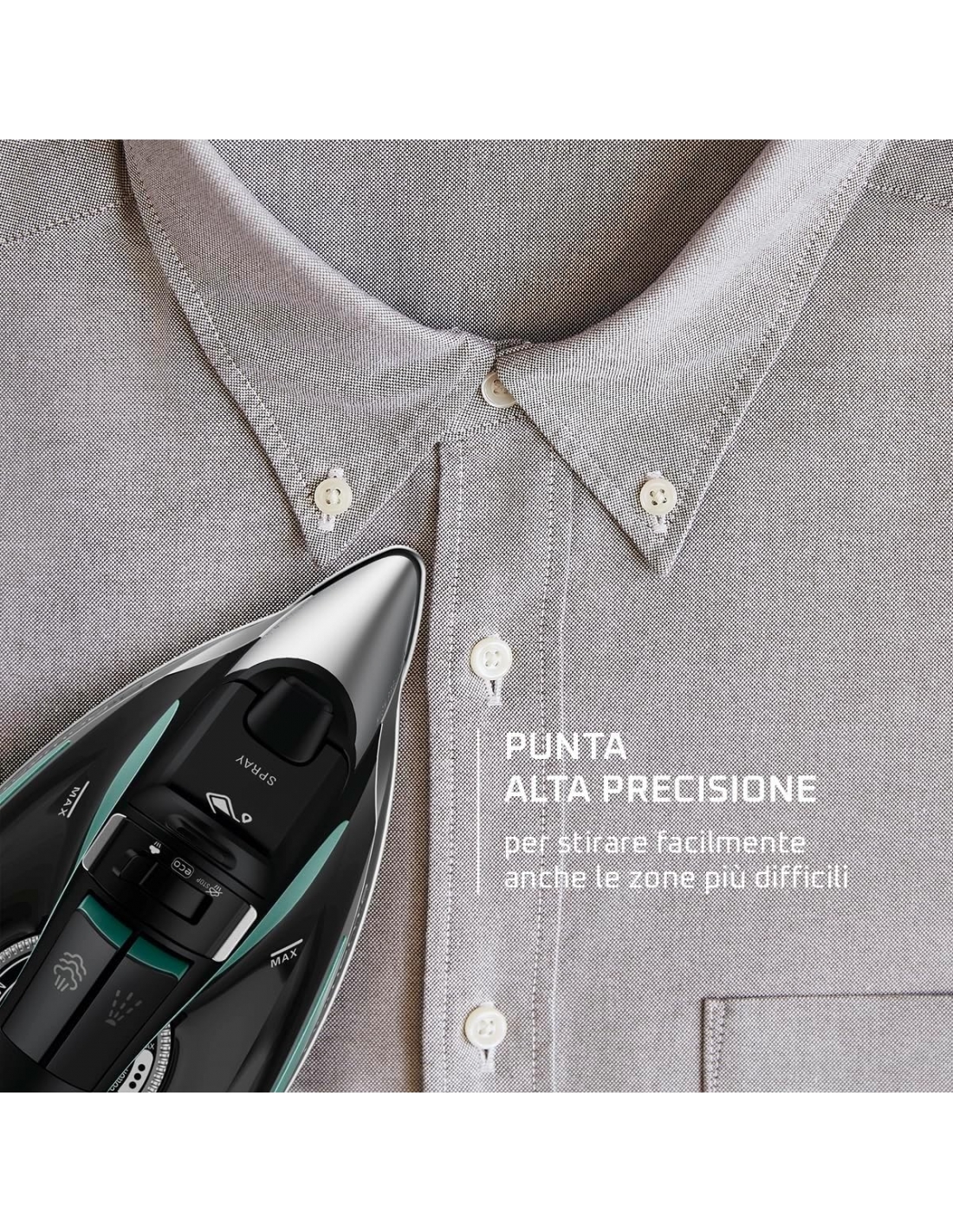 - PUNTA AD ALTA PRECISIONE: La punta di precisione consente di arrivare facilmente anche nelle zone più difficili, come orli stretti, cuciture e colletti, per una stiratura impeccabile