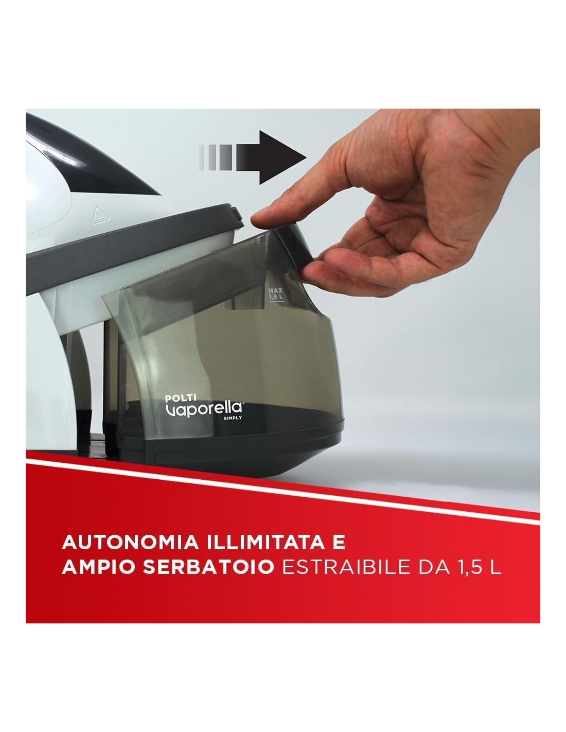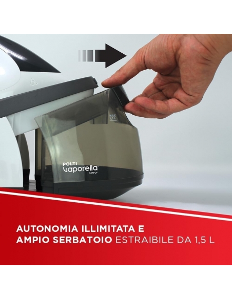 - Serbatoio estraibile da 1.5 L per lunghe sessioni di stiratura e riscaldamento rapido 2 minuti