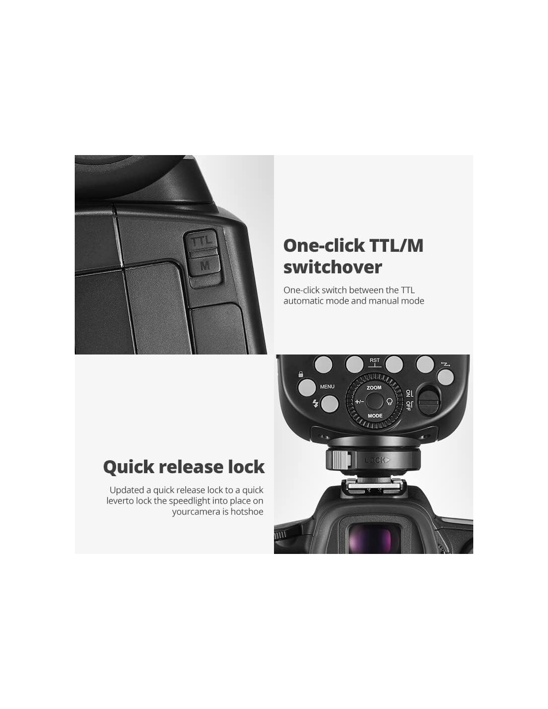 - Pulsante rapido per la commutazione della funzione manuale e TTL: GODOX V860IlI ha un pulsante rapido sul lato che consente di passare rapidamente dalla modalità manuale alla modalità TTL.