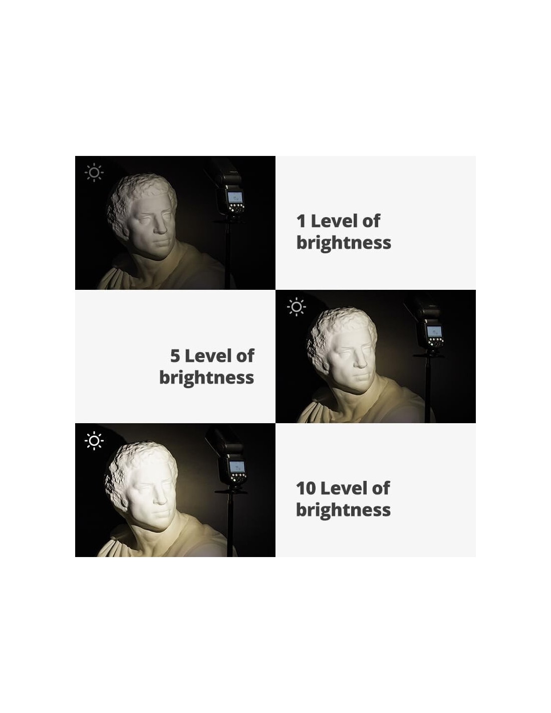 - Per facilitare la pre-visualizzazione e per combinarla con la luce ambientale, è stata aggiunta una luce di modellazione nella parte anteriore, con un'intensità regolabile su 10 livelli.