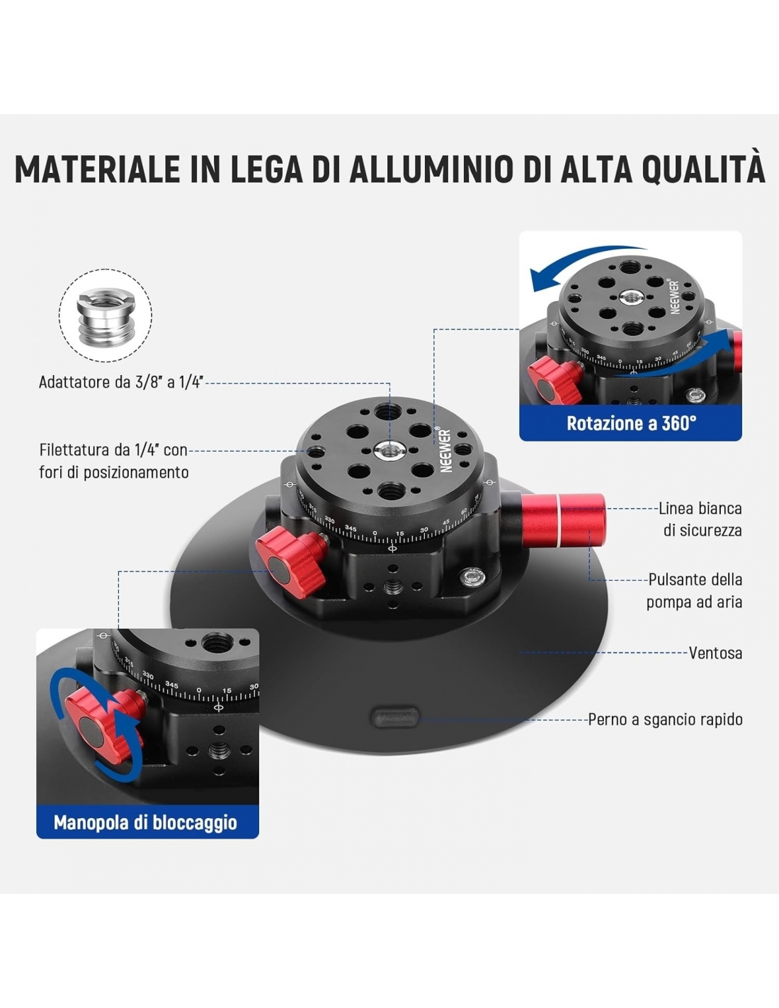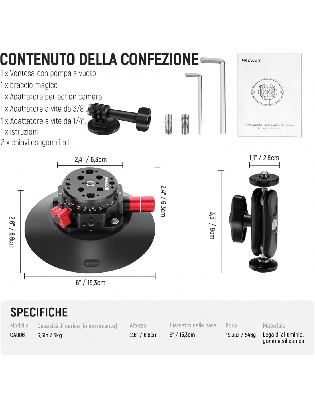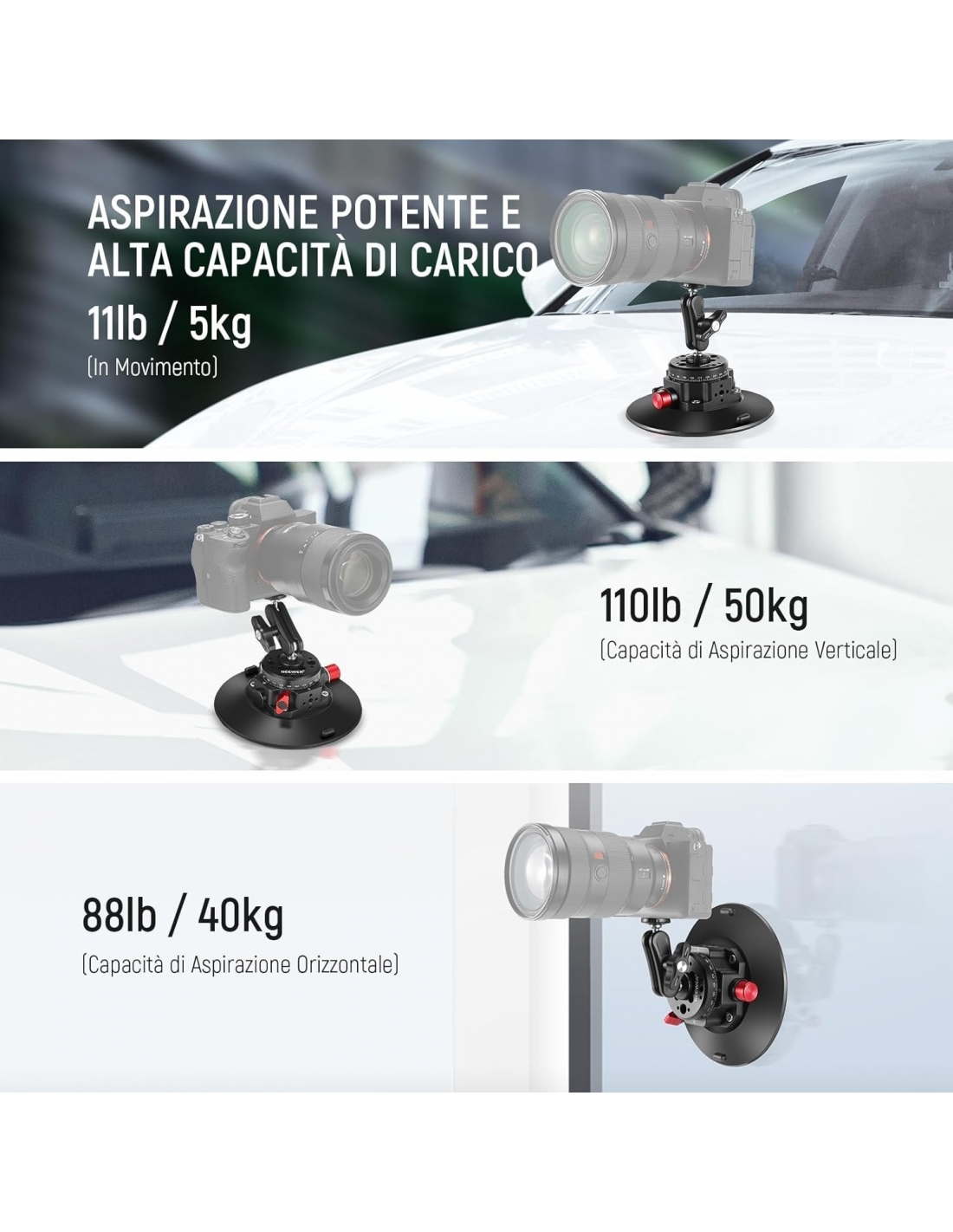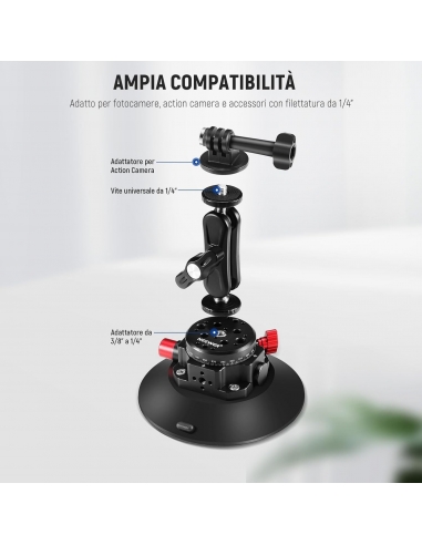 - 【Due Set di Potenti Ventose con Bracci Magici】 Il CA013 è dotato di potenti ventose a vuoto attivate dalla pompa che aderiscono saldamente alla maggior parte delle superfici e ruotano la fotocamera mirrorless, la fotocamera vlog, la action camera e lo smartphone a 360°. Due bracci magici articolati ciascuno con due teste a sfera da 1/4" fissano il dispositivo alla ventosa e offrono posizioni di montaggio flessibili