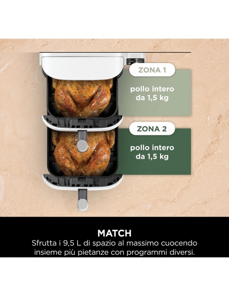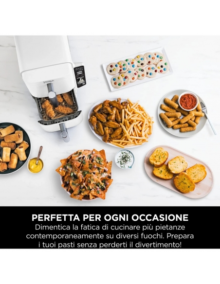 Sbizzarrisciti con ricette personalizzate grazie ai 6 programmi di cottura: imposta tempi e temperature diversi nei 2 scomparti regolabili autonomamente e prepara piatti completi da servire caldi, anche con poco spazio in cucina! Il 30% più compatta, ma capiente come sempre: Questa friggitrice ad aria a 2 scomparti può contenere un pollo arrosto intero da 1,4 kg in ogni scomparto da 4,75 L ed è perfetta per famiglie numerose e cene in compagnia. Perfetta per un massimo di 8 persone. Con un’altezza di 38,5 cm, può essere riposta sotto i pensili e lascia più spazio sul piano di lavoro.