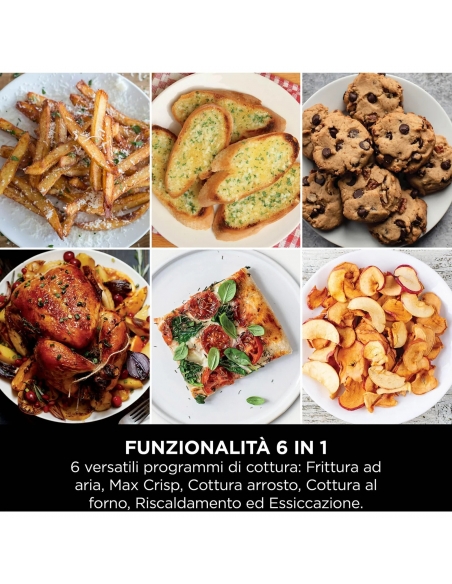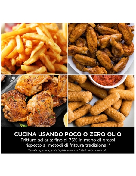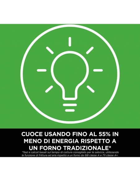 6 programmi di cottura: Friggi ad aria aggiungendo poco o zero olio: fino al 75% di grassi in meno rispetto ai metodi di frittura tradizionali. Oltre alla frittura ad aria, puoi usufruire delle funzioni Cottura arrosto, Cottura al forno, Essiccazione, Riscaldamento; e per cuocere i cibi congelati rendendoli extra croccanti utilizza Max Crisp. Inoltre, la friggitrice ad aria ti fa risparmiare sulla bolletta poiché consuma meno energia rispetto ai forni tradizionali.
