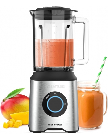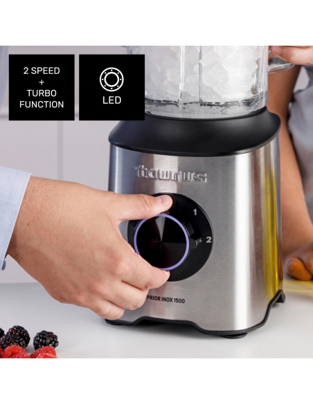 Taurus - Frullatore a Bicchiere Potente Prior Inox 1500W | 2 Velocità + TURBO | Caraffa in Vetro 2L | Lame a 6 Fili | Acciaio Inossidabile | Base Antiscivolo | BPA Free