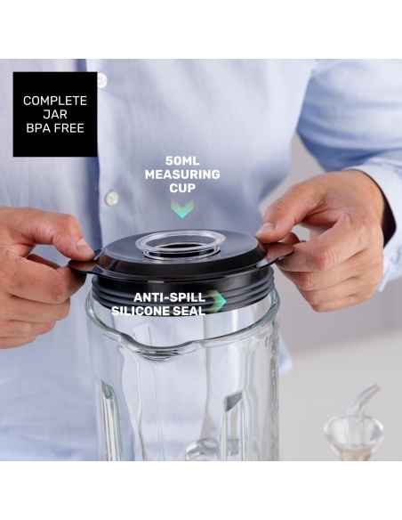 - 【CARAFFA IN VETRO DA 2L】Caraffa in vetro da 2L con design Tornado System per una miscela omogenea, beccuccio pratico, coperchio ermetico, apertura per ingredienti e misurino da 50ml.