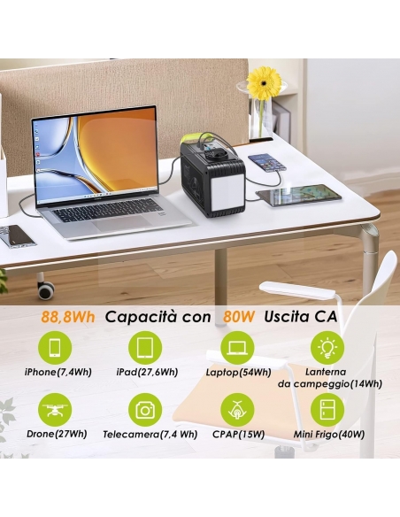 - 🔌MULTI-OUTPUT: La centrale elettrica portatile dotata di capacità di 88Wh(24000mAh, 3,7V), 2 porte USB QC3.0(18W MAX), 2 porte USB(5 V 2,4 A), 1 porta USB C(PD2.0,18W MAX). 1 porta CC (12-16,8V/10 A, 13A MAX), 1 presa di uscita (80W in esecuzione, 120W di picco). Alimenta telefono cellulare, iPad, tablet, fotocamera, radio, luce notturna, mini ventilatore e scanner da campeggio sotto gli 80W.