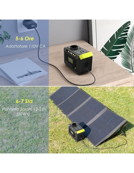- 🔋DUE MODALITÀ DI RICARICA: La centrale elettrica ricaricabile portatile da 88Wh con due metodi per caricarla. A parete è possibile caricare completamente l'alimentatore tramite presa CA(adattatore incluso) in 5 ore. Oppure può essere caricato sotto il sole con un pannello solare(15V-24V, 1,2A)(non incluso).