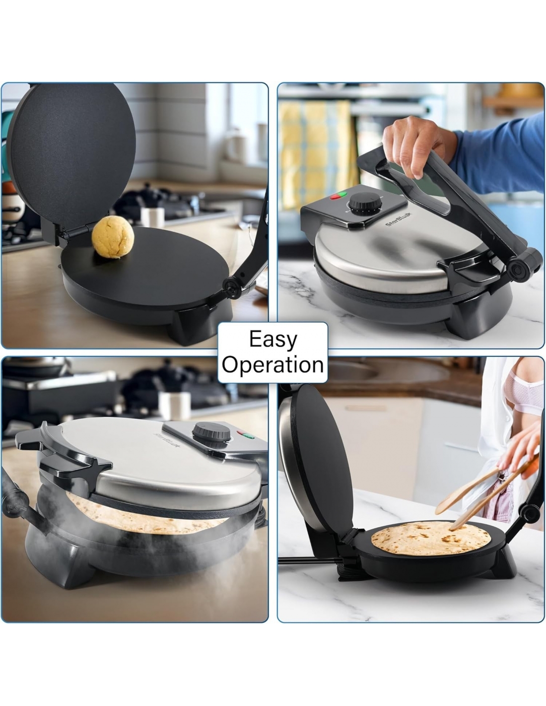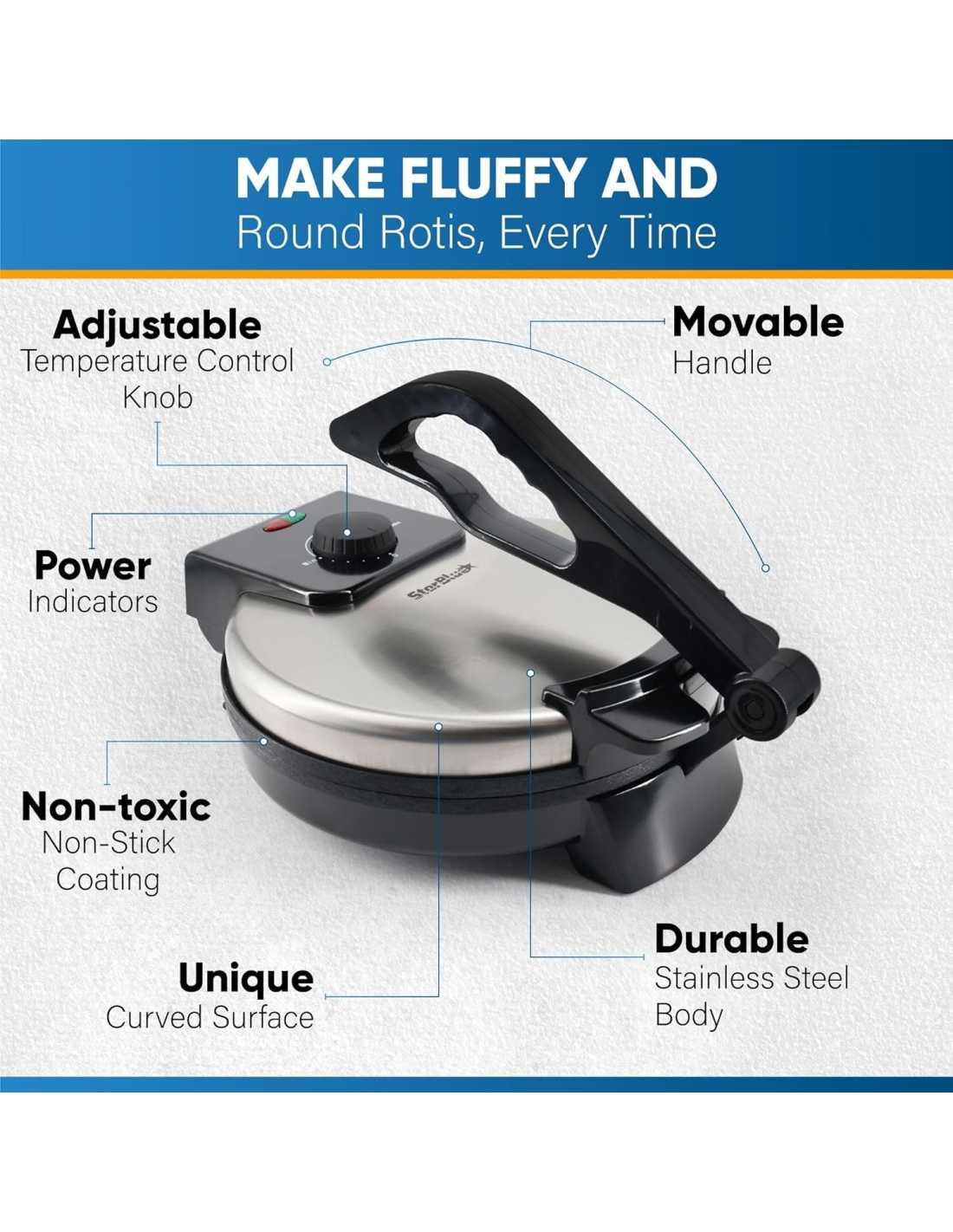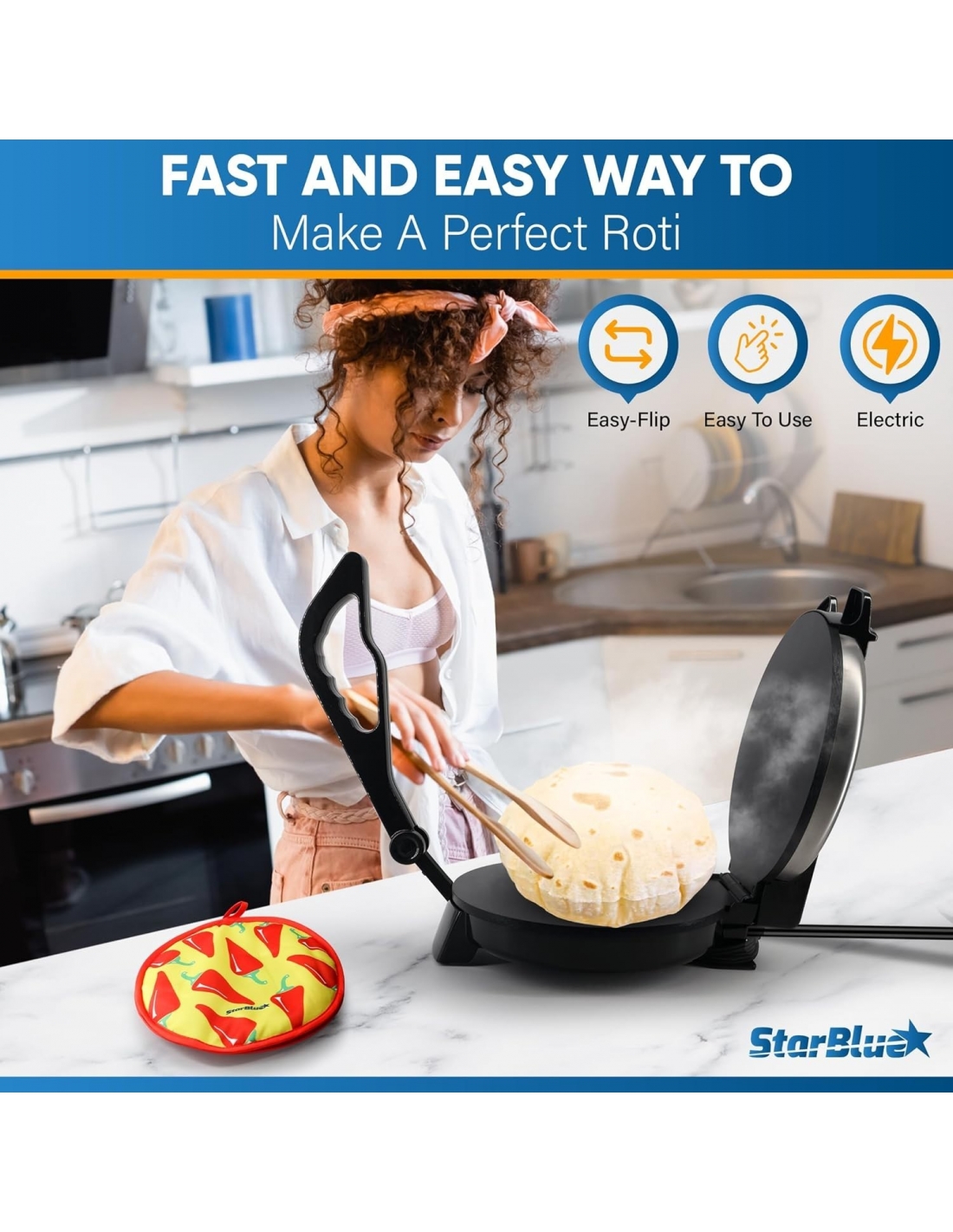 - ✔️ USI VERSATILI – La macchina per roti StarBlue è perfetta per preparare chapati, tortillas, naan, roti o paratha rotondi e soffici. Ha un rivestimento antiaderente sulle piastre, che la rende facile da pulire e da rimuovere eventuali residui di cibo.