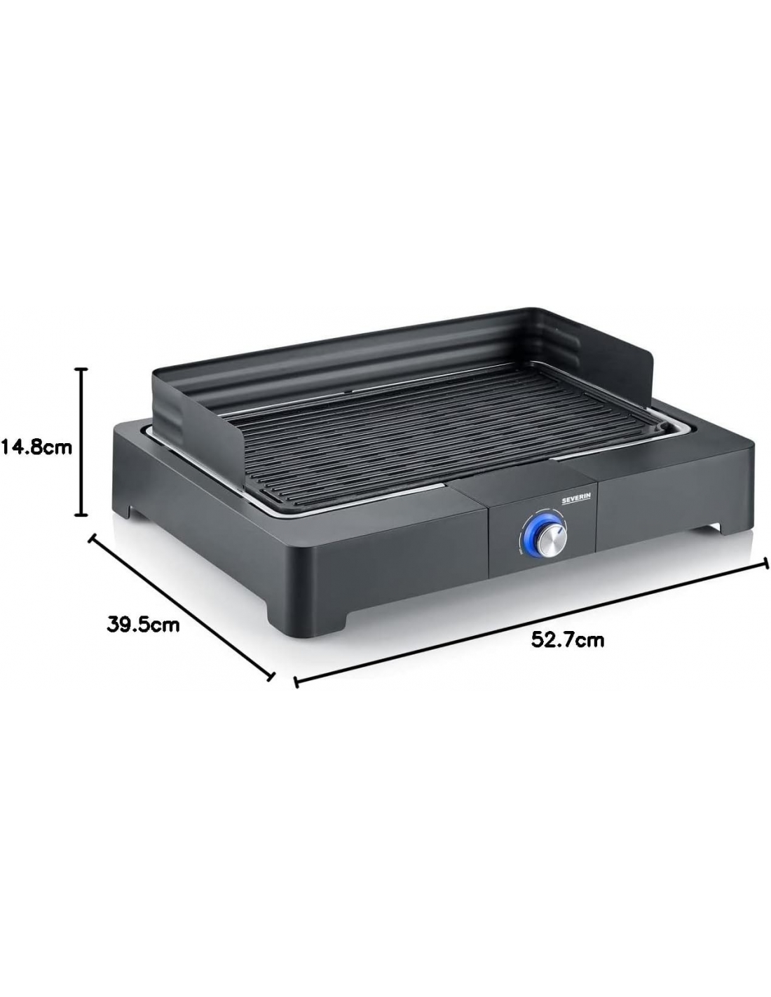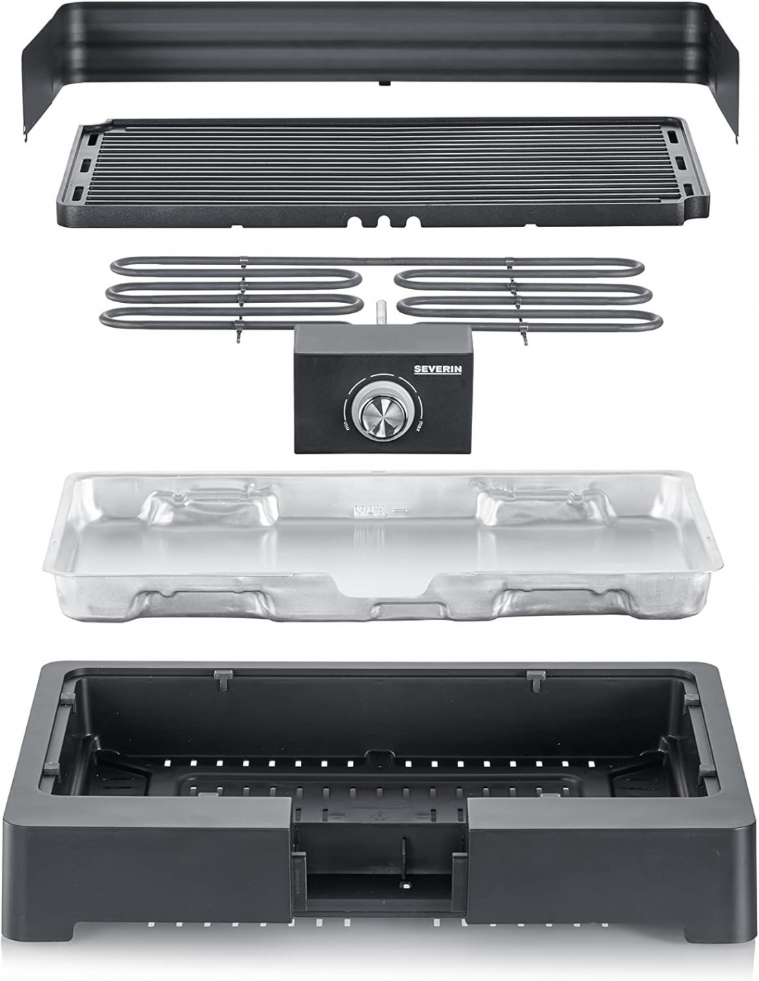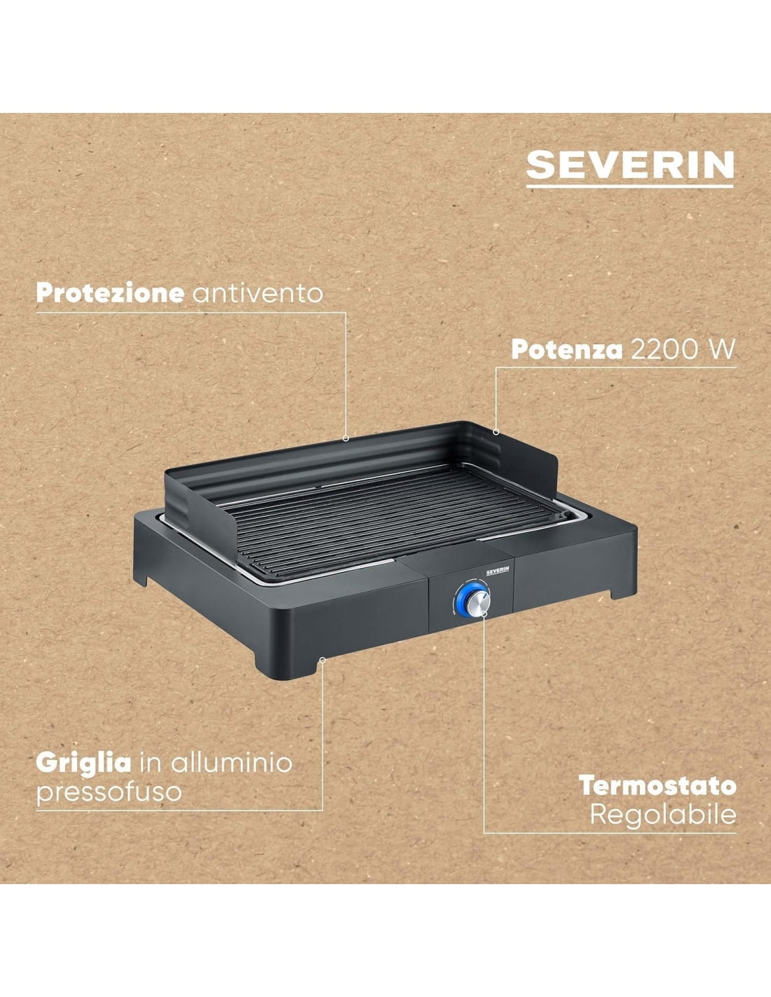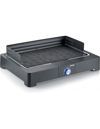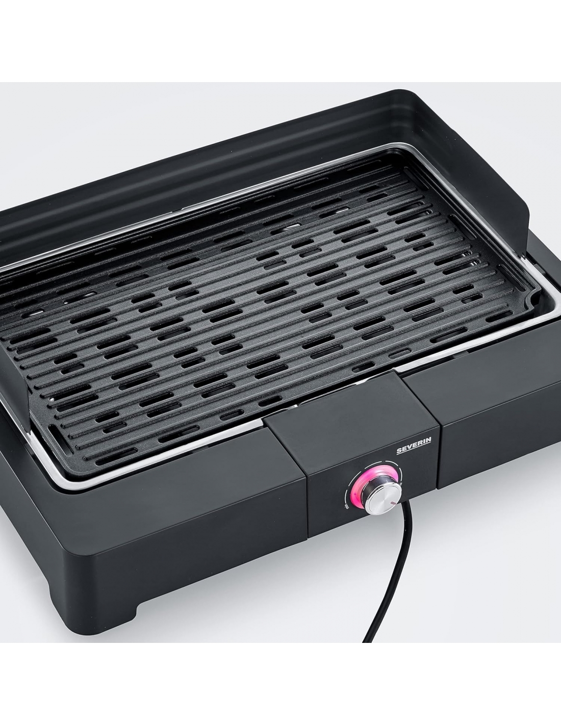- Dettagli prodotto – SEVERIN barbecue da balcone con piastra elettrica e protezione antivento, con regolatore della temperatura a LED, in alluminio pressofuso, 2.200 W, articolo numero PG 8567
