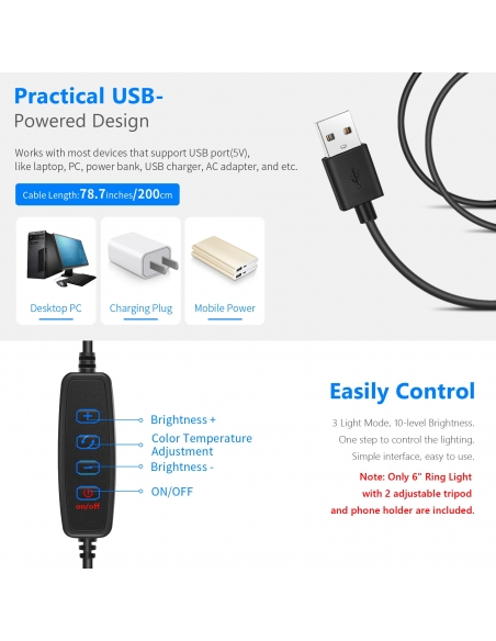 USB-Powered: Viene Fornito con un pratico connettore USB (Lunghezza Del Cavo: 78.7 pollici/200 centimetri), è possibile collegare nel vostro caricatore USB, alimentazione elettrica portatile, PC, computer portatile, o qualsiasi altro dispositivo con una porta USB. Molto conveniente per ricaricare il anello di luce in qualsiasi momento e ovunque. C' è un interruttore in il cavo USB che si può scegliere la luminosità e modalità di illuminazione attraverso di essa.