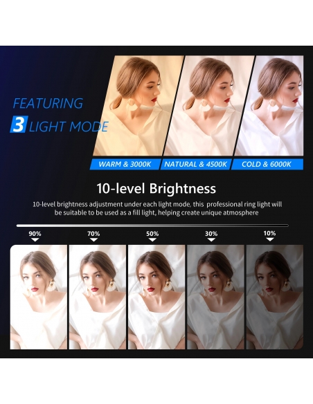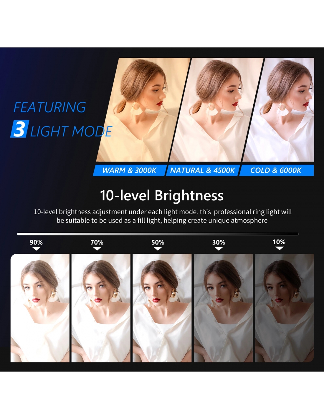 6-inch Dimmerabile Anello di Luce: dotato di 48pcs perle di luce con lunga durata di vita; progettato con 3 modalità di illuminazione (Luce Fredda, Modalità di Modalità di Luce Mista, e Modalità di Luce Calda) E 10 regolabile luminosità in ogni modalità di luce per la vostra scelta con la linea interruttore di controllare facilmente. Nessuna luce intermittente, abbagliante, e abbagliamento, fornendo ombre e anche di illuminazione, rendere il vostro viso più stereoscopica e i dettagli del prodotto più chiara. La testa della lampada può ruotare di 360 ° a sinistra e destra, e di vibrazione 180 ° avanti e indietro