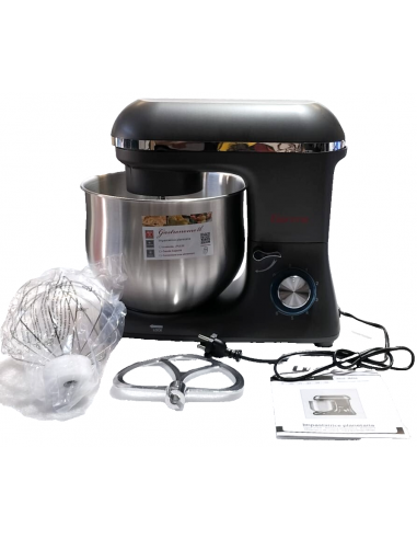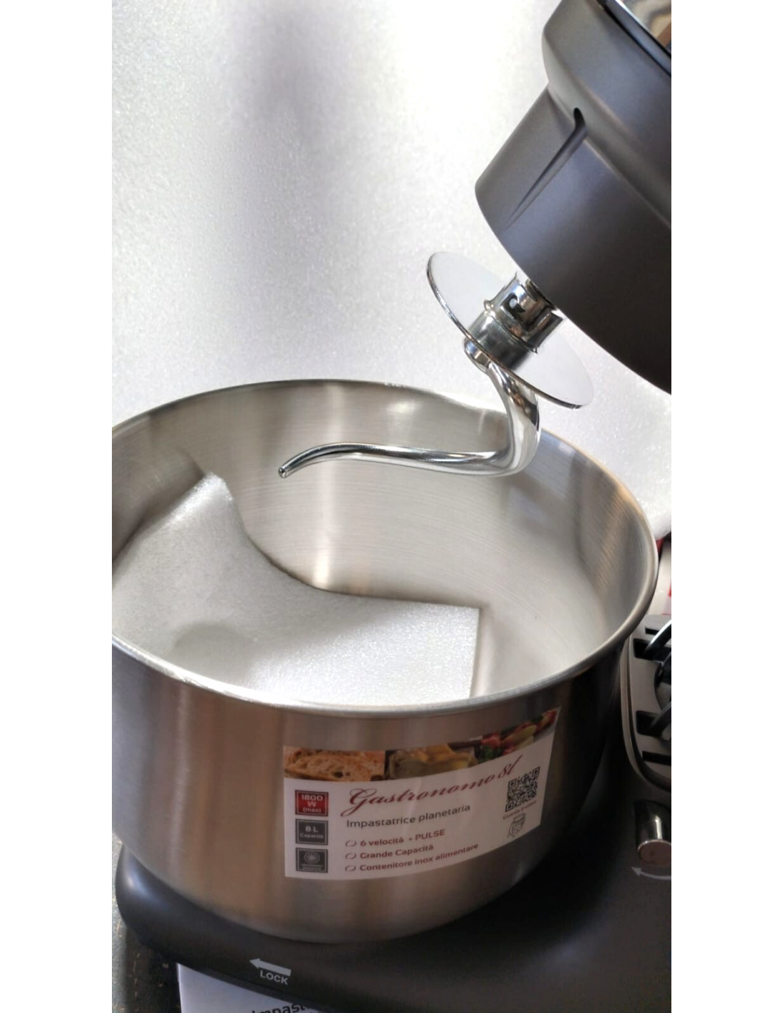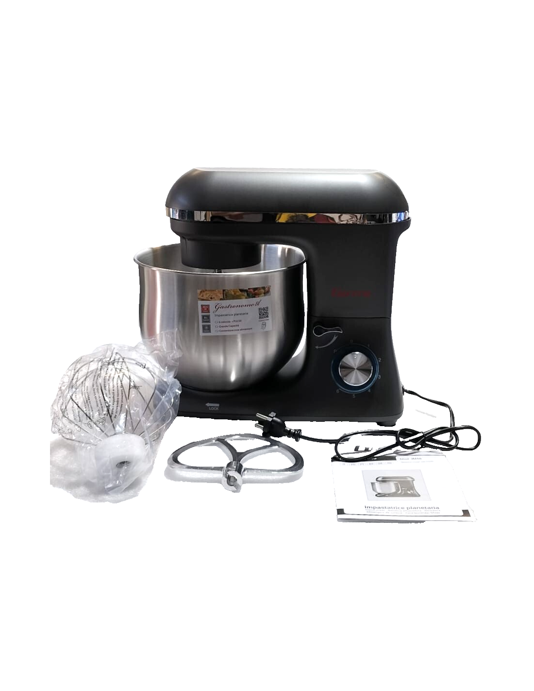 - Accessori inclusi: uncino impastatore e mescolatore in alluminio, frusta sbattitrice in acciaio inox, coperchio in plastica trasparente