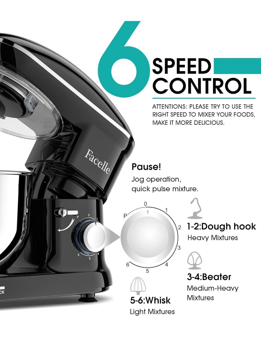 - 【Impastatrice 3 in 1】: il impastatrice professionale Facelle è dotato di frusta, gancio per impastare e frusta, con controllo della velocità 6+P, può facilmente preparare più di 160 tipi di alimenti, come torte, pane, biscotti, pizza, muffin, waffle, ecc. Il paraspruzzi aperto aiuta ad aggiungere ingredienti durante il lavoro.
