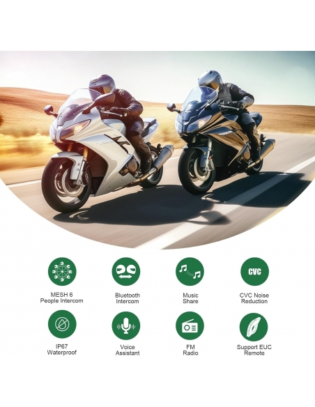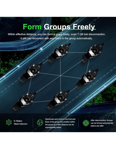 - [Tecnologia Interfonica Mesh Avanzata]: l'interfono EJEAS Q8 Mesh adotta la tecnologia avanzata Mesh 3.0 e supporta 6 persone che parlano contemporaneamente. La distanza dell'interfono è di 600~1000 m. Una volta disconnesso, può riconnettersi automaticamente entro la distanza dell'interfono per garantire la stabilità della chiamata.