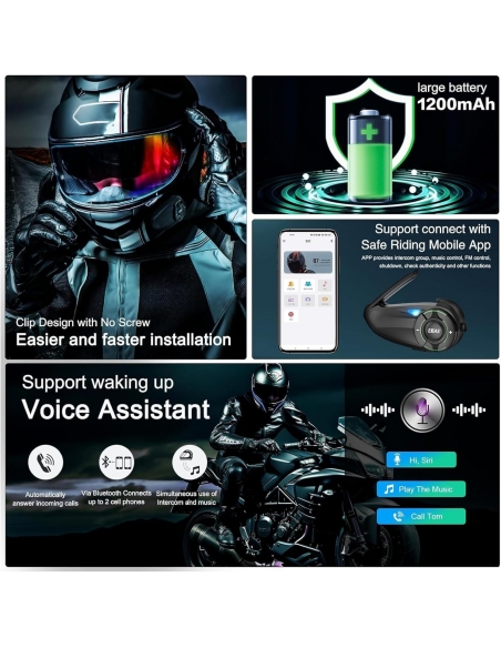 - [Batteria Grande da 1200 mAh e Impermeabile IP67]: Batteria al litio ricaricabile integrata da 1200 mAh, il tempo di ricarica è di circa 3 ore, dopo la ricarica completa, il tempo dell'interfono Mesh è di 9 ore, il tempo dell'interfono Buletooth è di 17 ore, il tempo di riproduzione della musica dura fino a 29 ore, Tempo di standby fino a 230 ore. Livello impermeabile IP67, utilizzabile liberamente nei giorni di pioggia.
