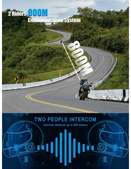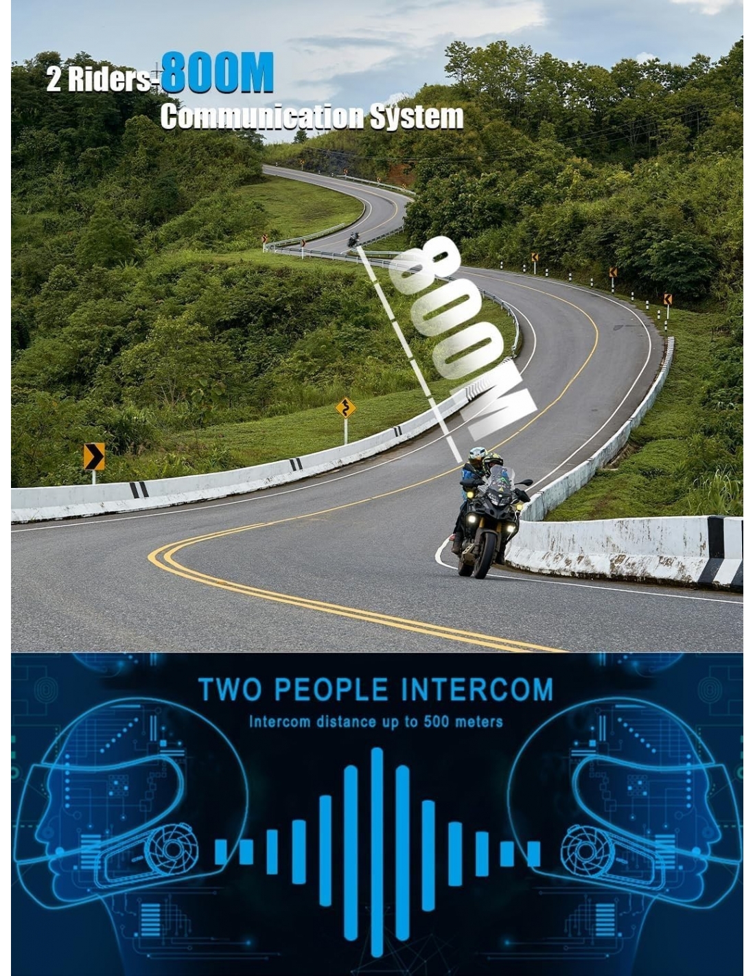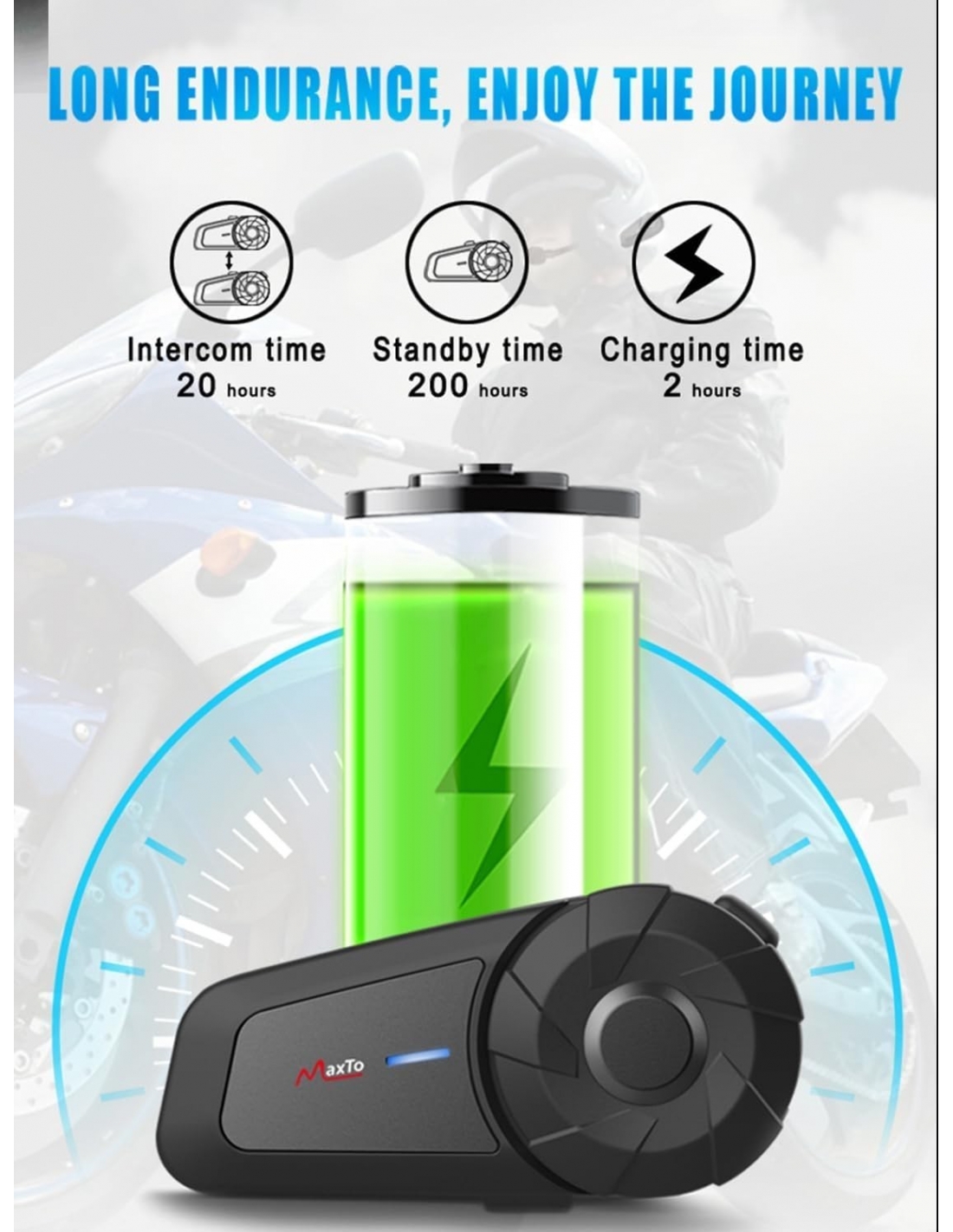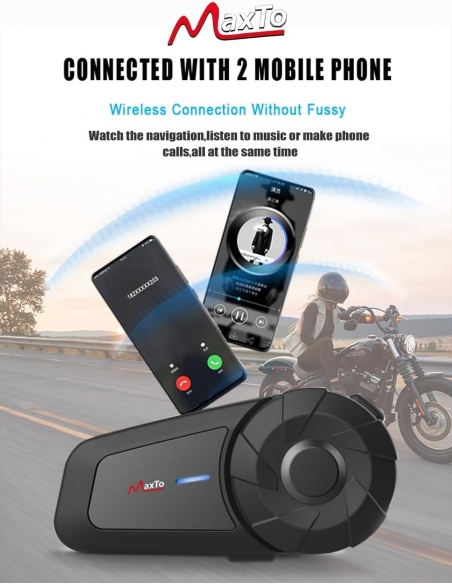 - 800 m 2 Riders Group Intercom e accoppiamento universale: l'auricolare Bluetooth per moto MAXTO MX1 può parlare contemporaneamente a 2 piloti, ma basta premere un pulsante per selezionare due piloti qualsiasi per parlare. Funzione di accoppiamento universale, può essere accoppiato non solo con altri dispositivi di comunicazione Bluetooth, ma anche con la maggior parte degli altri auricolari Bluetooth sul mercato.