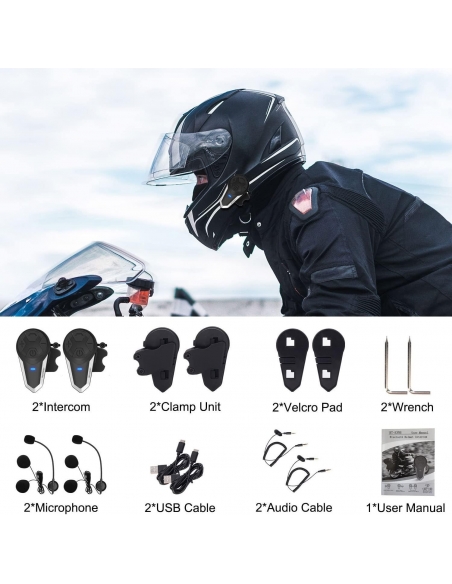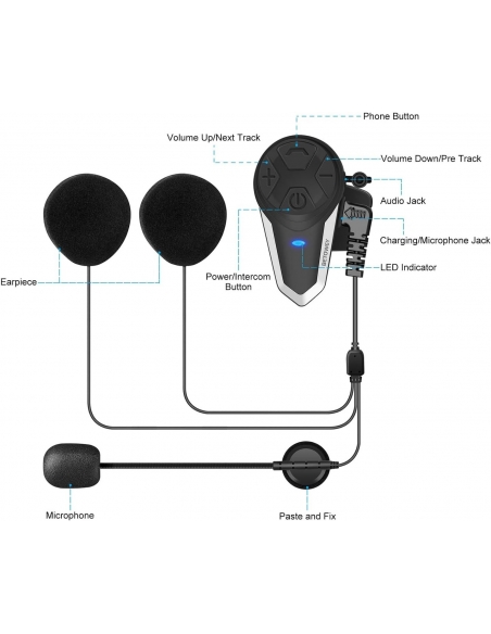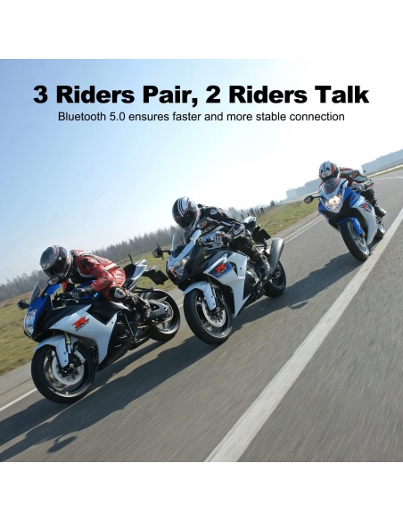 - Il auricolari bluetooth moto può realizzare la modalità interfono wireless da pilota a pilota o da pilota a passeggero e offre comunicazioni interfono entro un raggio di 1000 m, velocità fino a 120 km/h (dipende dall'ambiente). Capace di collegare 3 interfoni e 2 interfoni possono comunicare contemporaneamente.