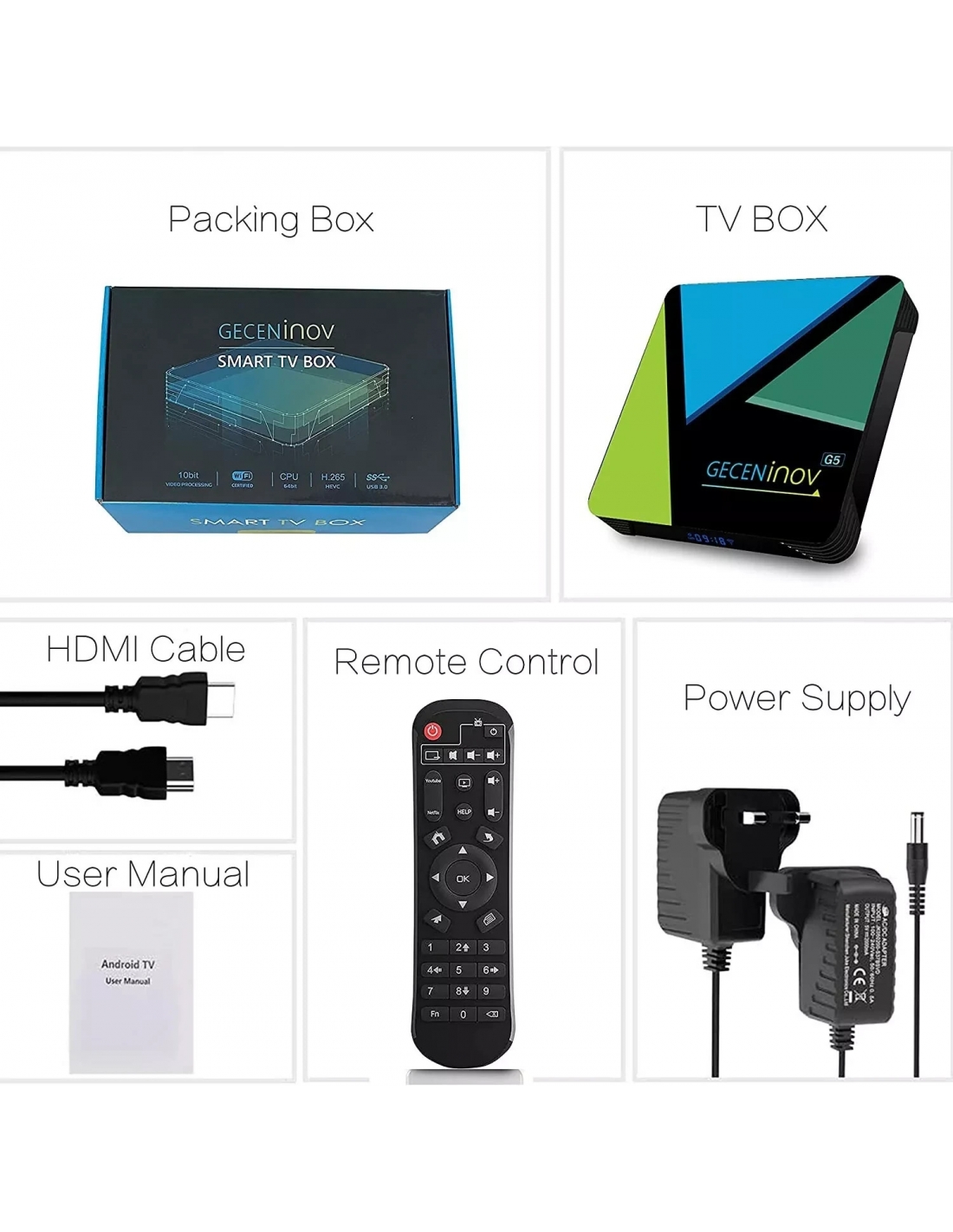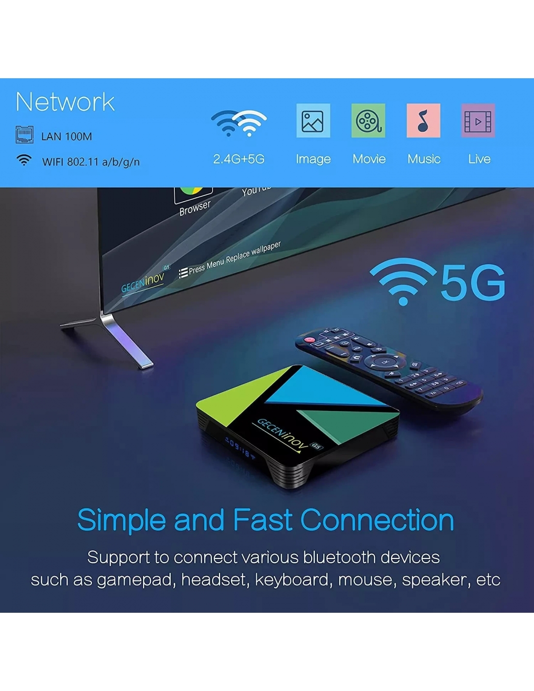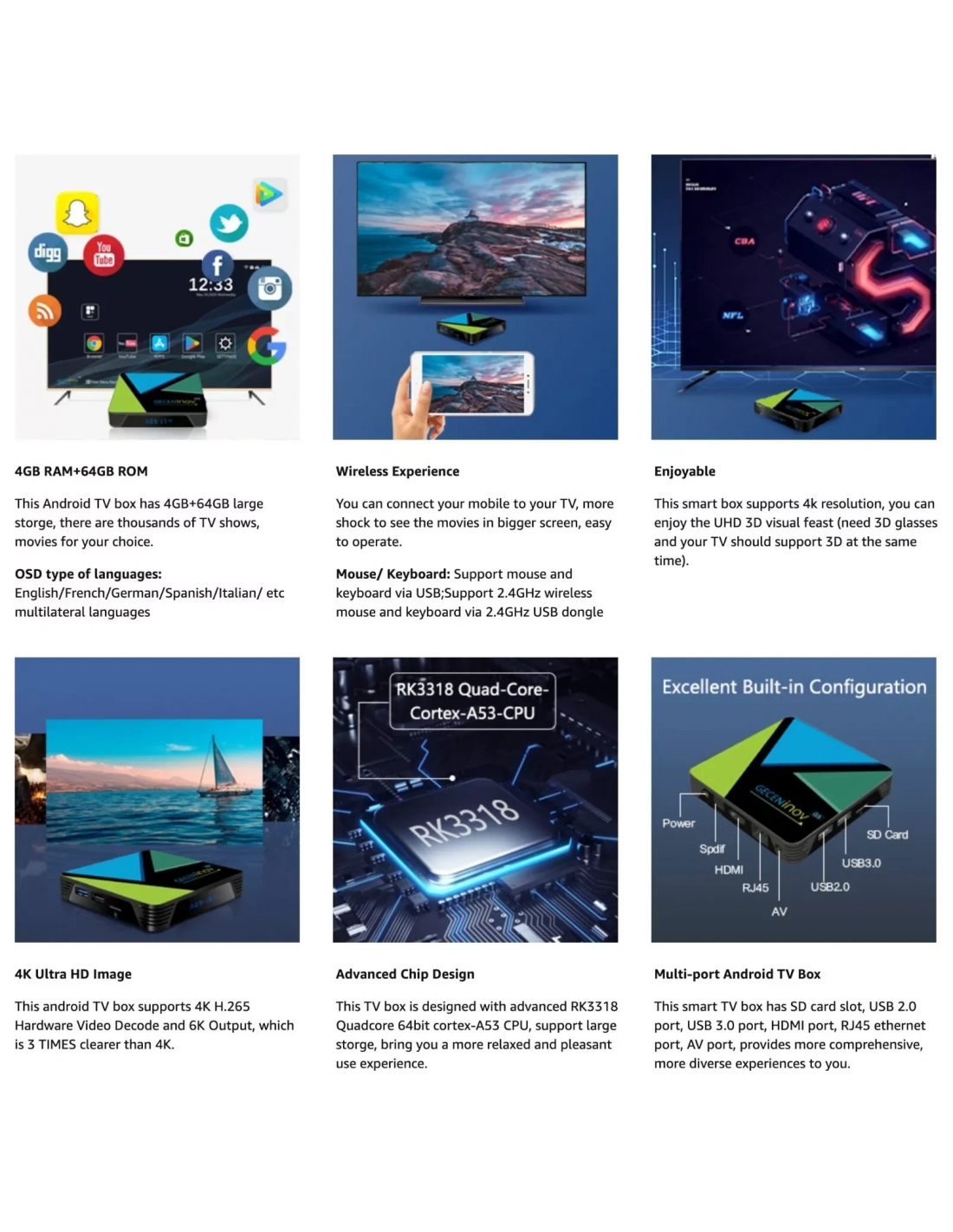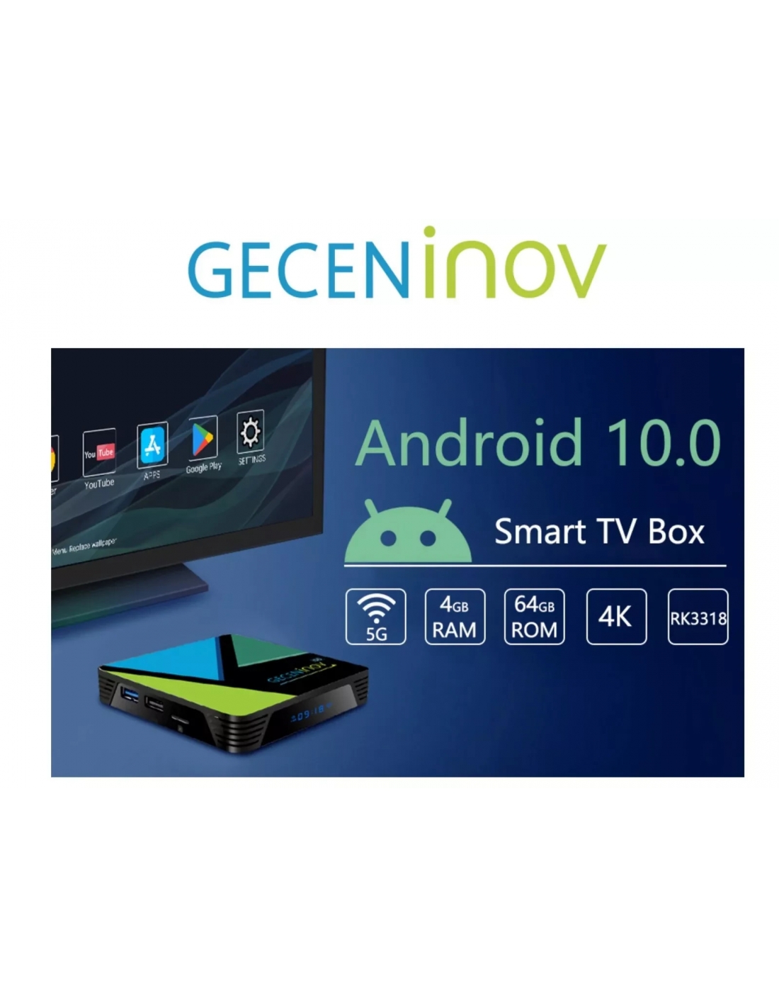 Geceninov Android TV Box 10 bit, 4K 4GB RAM/64GB ROM H265
