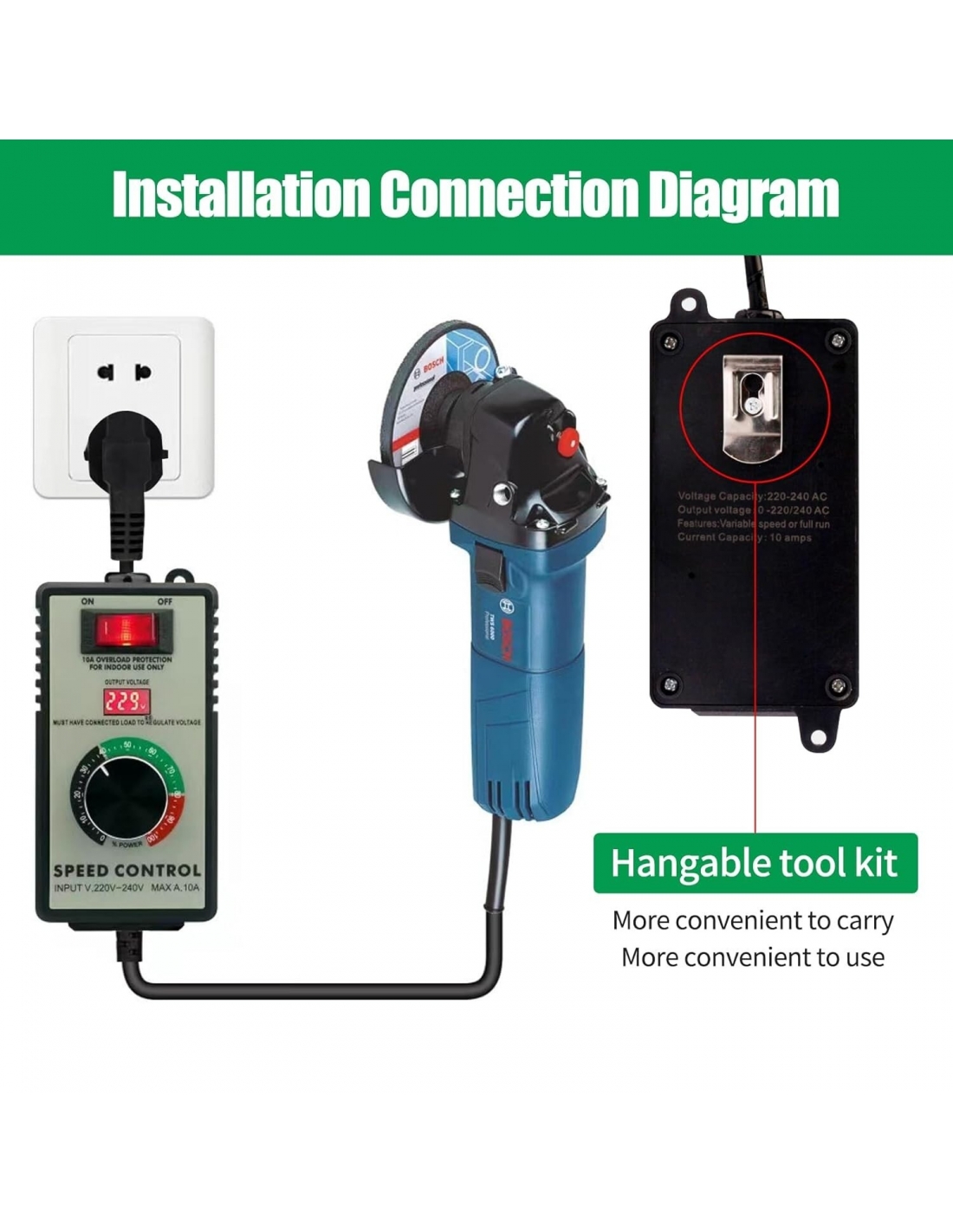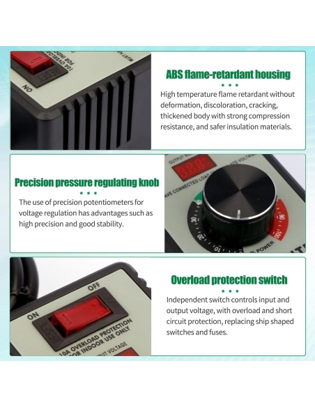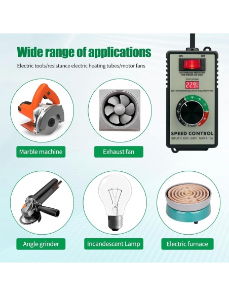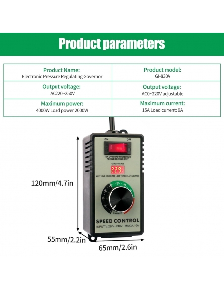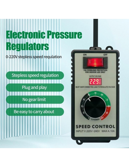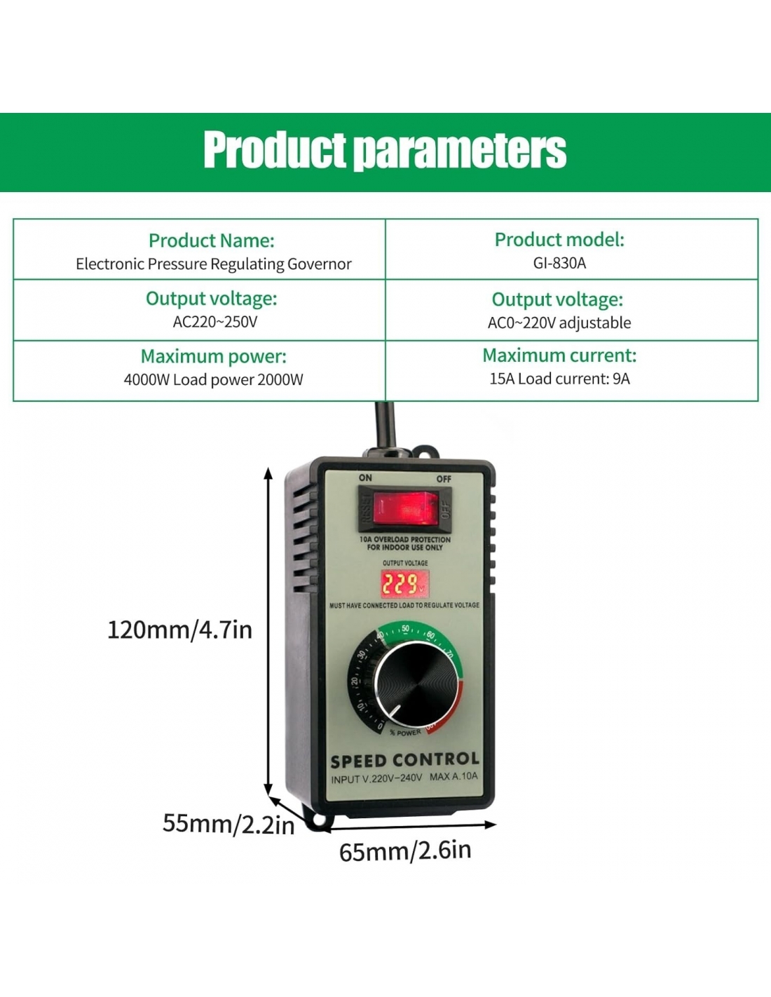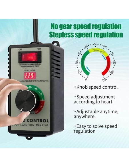 - Protezione da sovraccarico: l'indicatore di tensione può monitorare la tensione corrente in qualsiasi momento. Il regolatore di velocità ha un controllo interruttore. Se il dispositivo supera la potenza e la tensione di carico, l'interruttore interrompe automaticamente l'alimentazione. Può anche essere controllato tramite l'interruttore per proteggere il regolatore.