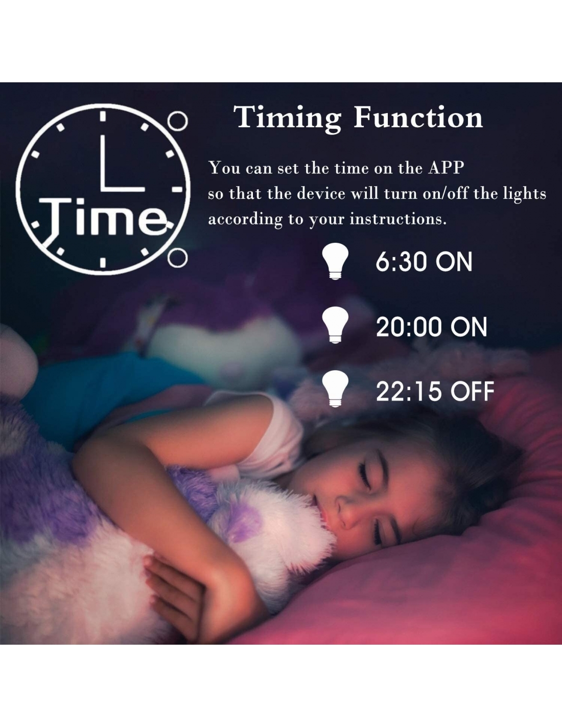 - ✤ 【Interruttore timer】 Consente di accendere/spegnere le luci a una certa ora o di sincronizzarsi con l'alba e il tramonto. Non dimenticare di spegnere le luci. Oppure puoi impostare il tempo di programmazione per spegnere le luci della stanza quando i tuoi bambini dormono. La vita può essere facilmente programmata