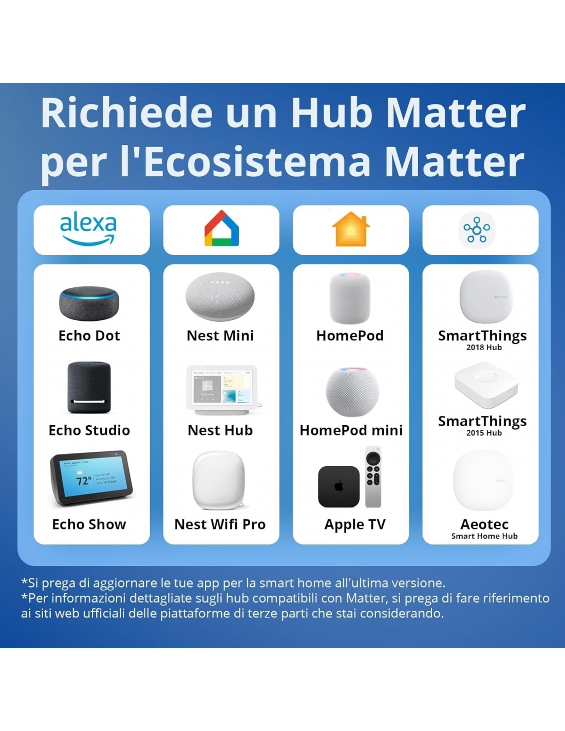 - Matter Protocol: Le piattaforme che supportano il protocollo Matter richiedono un Matter Hub se integrate con sistemi abilitati per Matter come Home Assistant, Alexa, Google Home, Apple Home, ecc