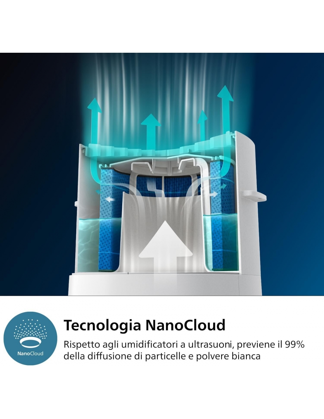 - Umidificazione igienica e altamente efficiente per un'umidità ottimale (650 ml/h) con 4 diverse impostazioni che consentono di regolare l'umidità al livello desiderato