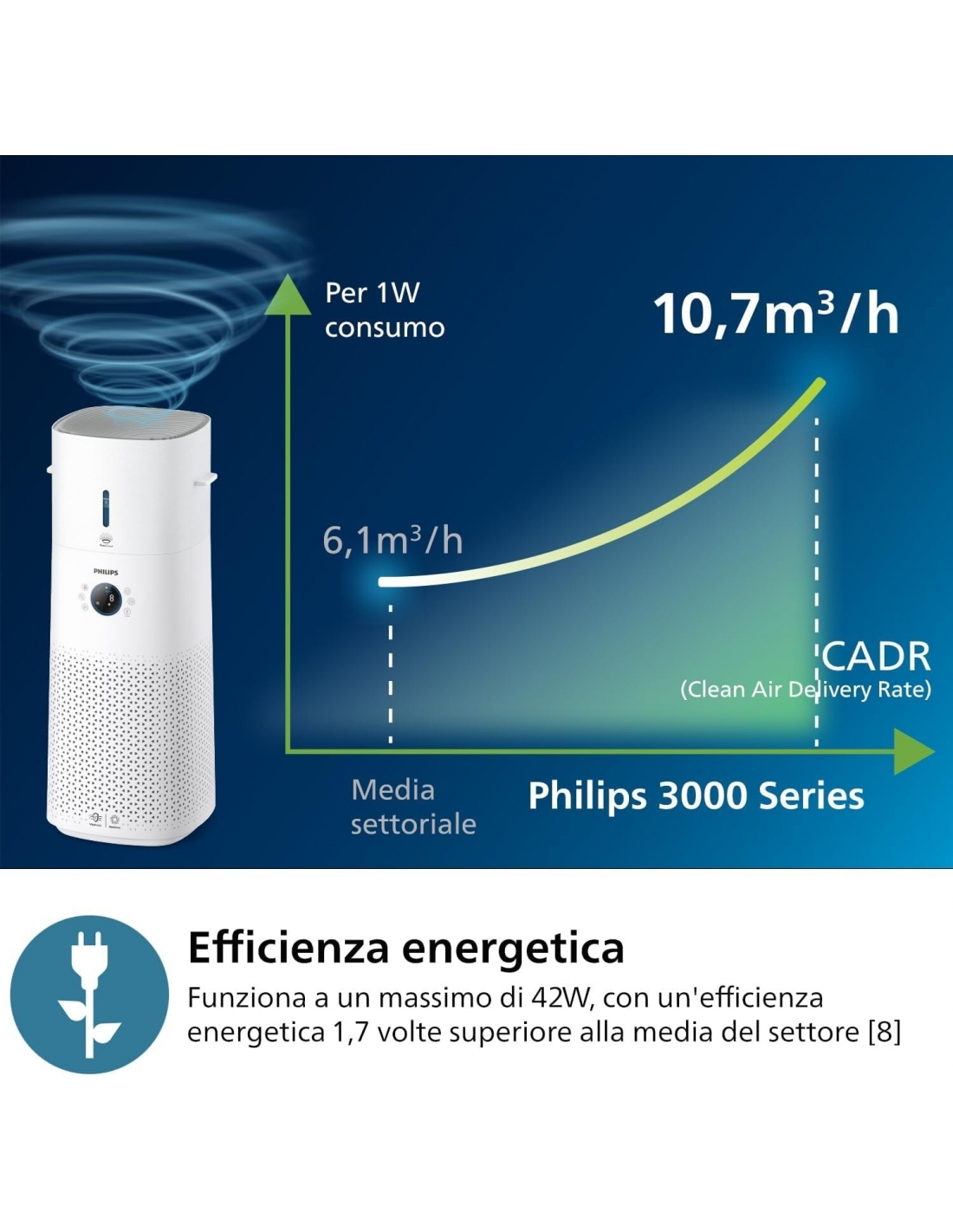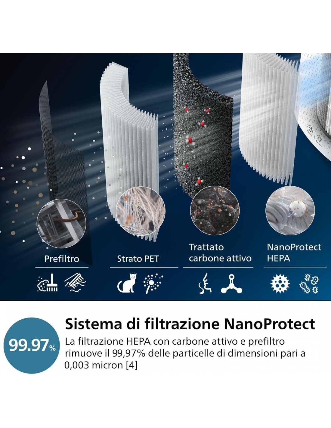 - Elimina il 99,97% degli agenti inquinanti grazie alla tecnologia NanoProtect HEPA(4). Con un CADR di 505 m3/h(5), purifica ambienti fino a 131 m2(1), garantendo una protezione contro pollini, polvere, virus, batteri, forfora di animali domestici, acari della polvere, spore di muffa, gas, formaldeide, odori e allergeni