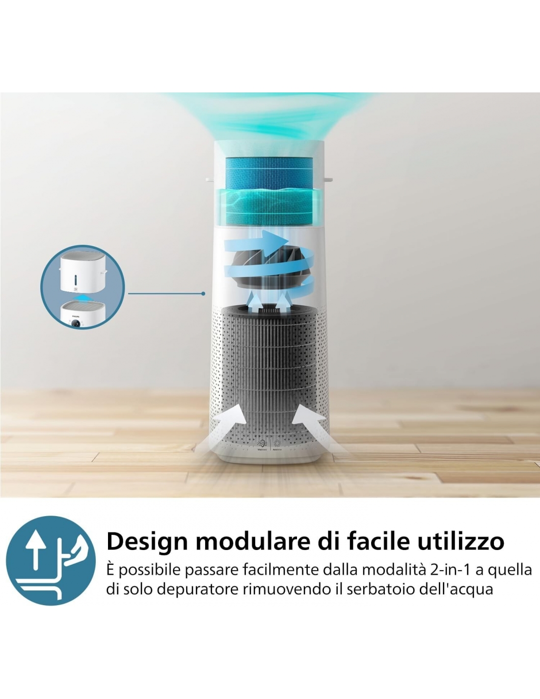- Il contenitore dell'acqua rimovibile da 4 litri consente di passare facilmente dalla modalità 2-in-1 a quella di solo purificazione, offrendo prestazioni ancora più elevate per la purificazione