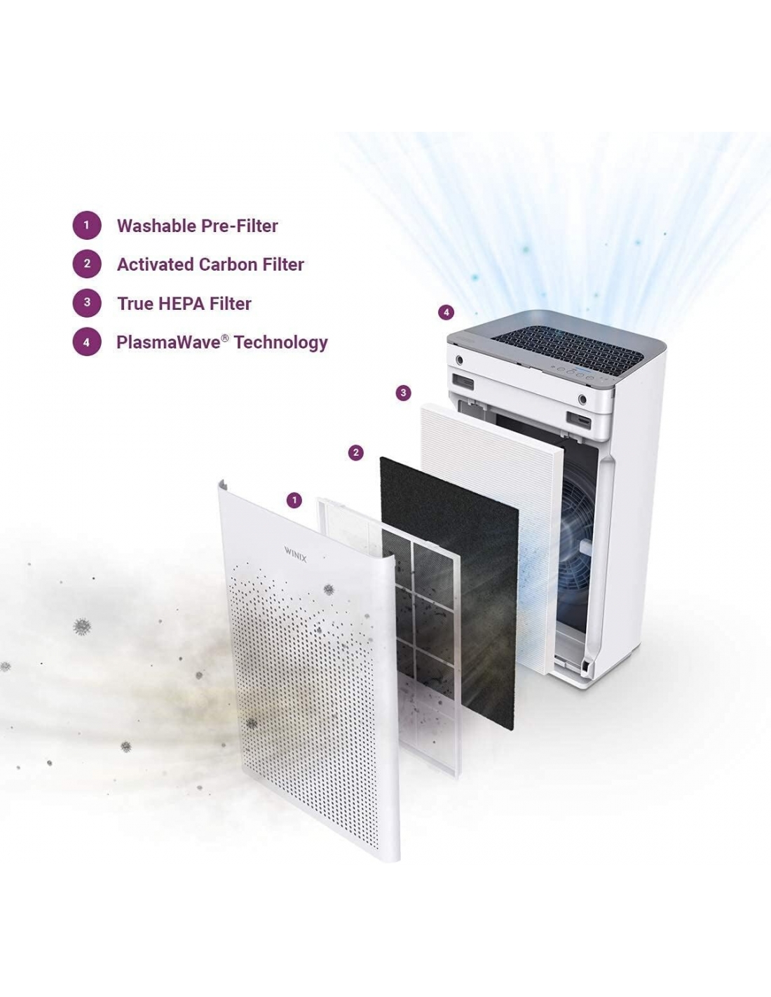 - SISTEMA DI FILTRAZIONE A 4 FASI: Il purificatore d'aria ZERO S utilizza un Prefiltro Lavabile a maglia fine che rileva e cattura le particelle sospese nell'aria, un Filtro a Carbone Attivo che assorbe i COV e altri odori domestici, un Filtro HEPA H13 cattura il 99,999% degli allergeni più piccoli e particelle dell'aria (fino a 0,1 micron) e la Tecnologia WINIX PlasmaWave che aiuta efficacemente a ridurre virus (H3N2) e batteri nell'aria senza produrre ozono dannoso.