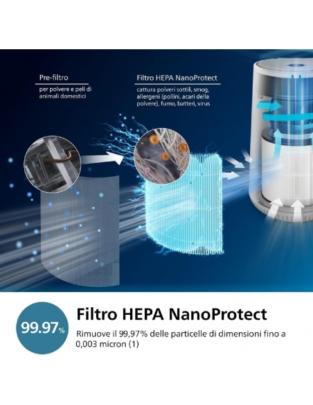 - Rimuove il 99,97% delle particelle(1): La tecnologia HEPA NanoProtect intrappola gli inquinanti grazie ad e una carica elettrostatica, purificando l'aria fino a 2 volte in più rispetto ai tradizionali filtri HEPA H13(2)
