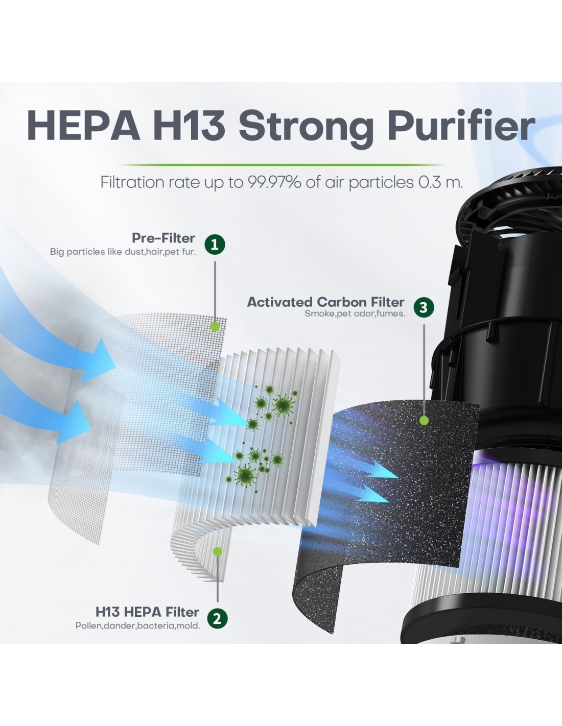 - Con una struttura filtrante a 3 strati, pre-filtro, Filtro ad alta efficienza, carbone attivo, questo purificatore d'aria protegge la salute vostra e della vostra famiglia.