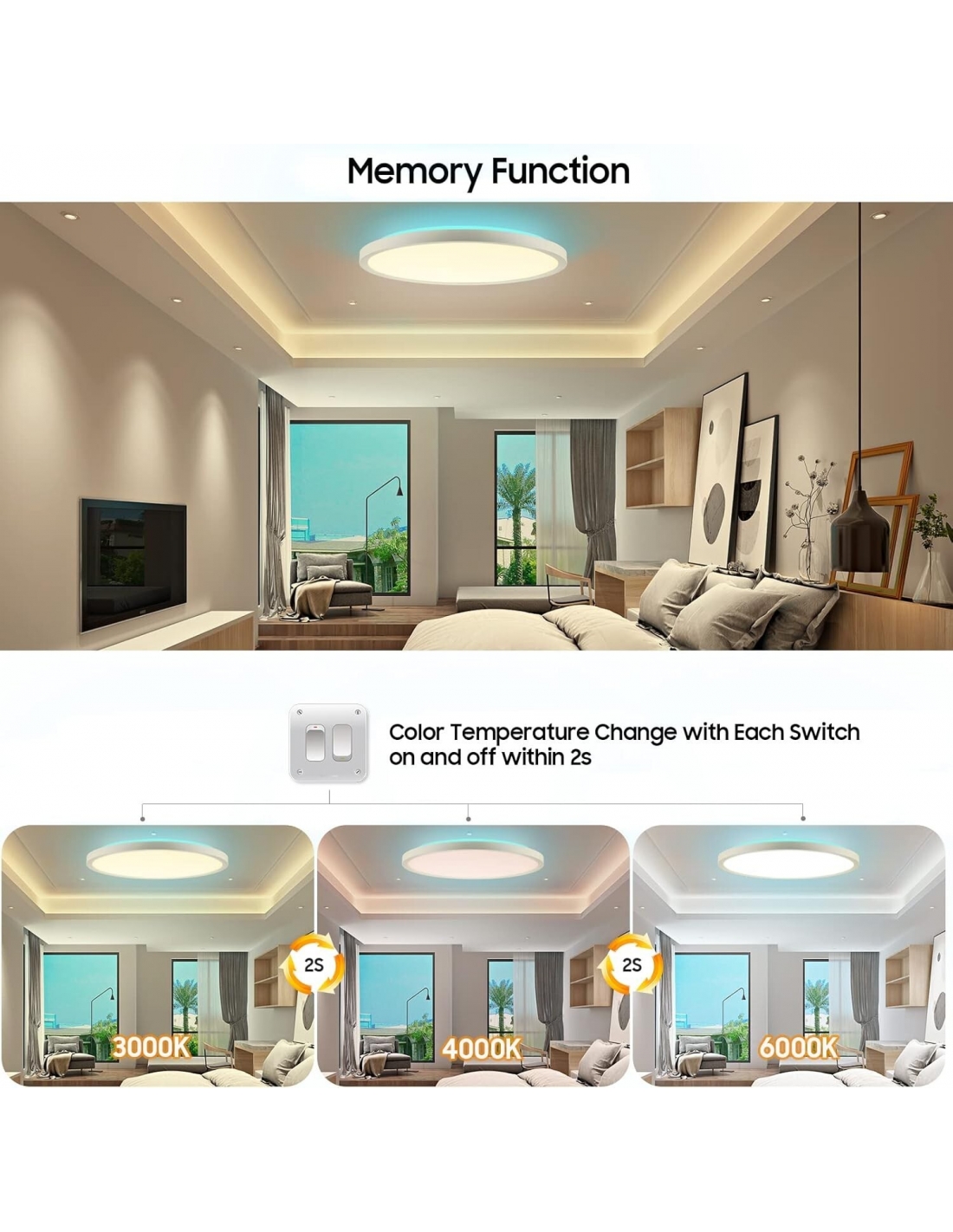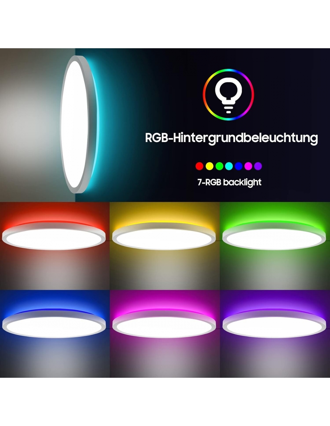 - L'esclusivo design di retroilluminazione RGB a 7 colori e 4 modalità (sfarfallio di inseguimento colore RGB, cambio colore veloce/lento, cambio colore RGB automatico, surround monocromatico RGB a 13 colori), dimmerabile 3000K-6500K; Caratteristica della luce notturna; RGB Color Changing Backlight (7 Colori opzionali); La luce anteriore (luce diurna) e la retroilluminazione RGB possono essere illuminati contemporaneamente o solo uno di essi.100%-20% dimmerabile, 3200 lumen lampada da soggiorno a pannello piatto super luminoso. Come luce notturna, la luminosità minima delle plafoniere per camera da letto può raggiungere il 20% a 3000K bianco caldo. I bambini o gli anziani si sentiranno più sicuri di notte grazie alla tranquilla fonte luminosa accogliente.