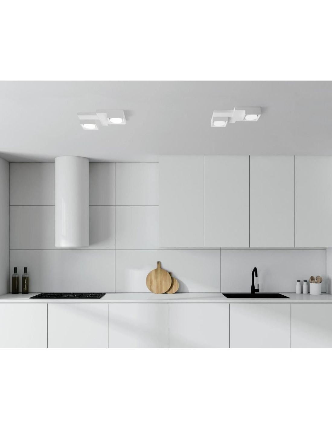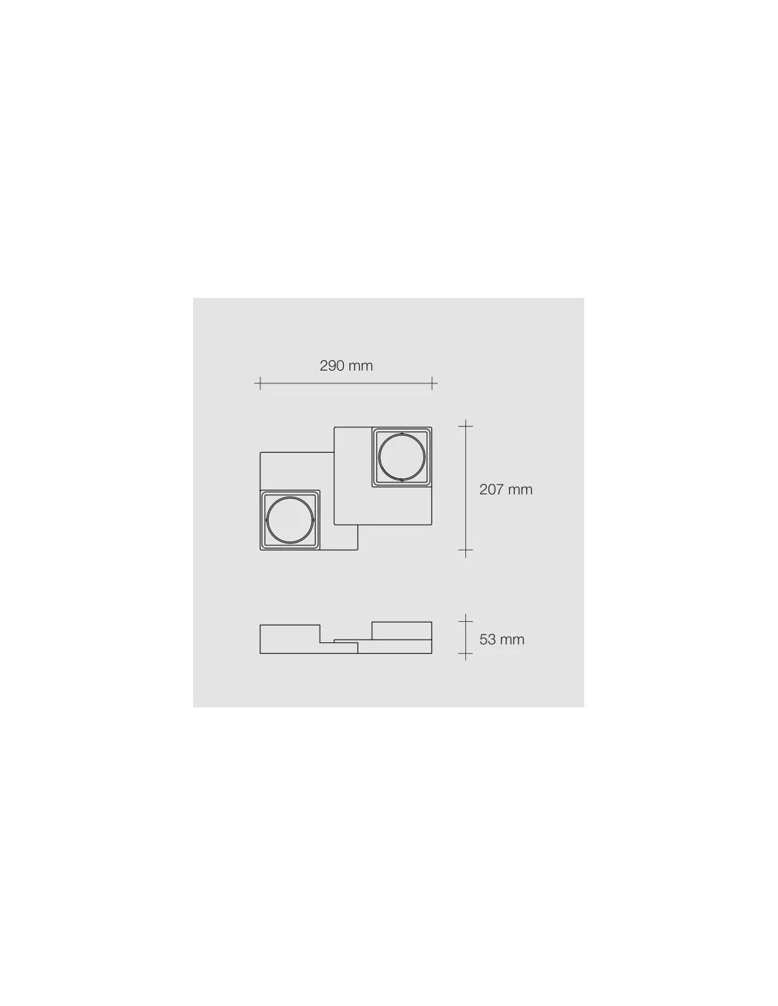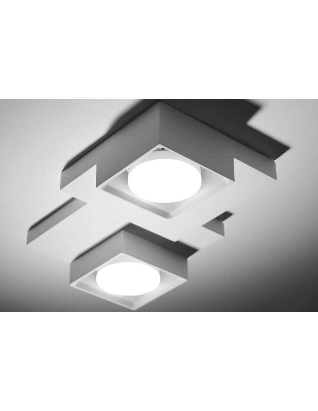 Plafoniera dal design moderno che si presenta con due quadrati realizzati in gesso bianco che può essere tinteggiato a vostro piacimento per chi desidera un colore diverso da quello classico.