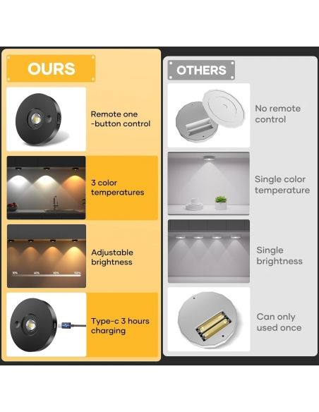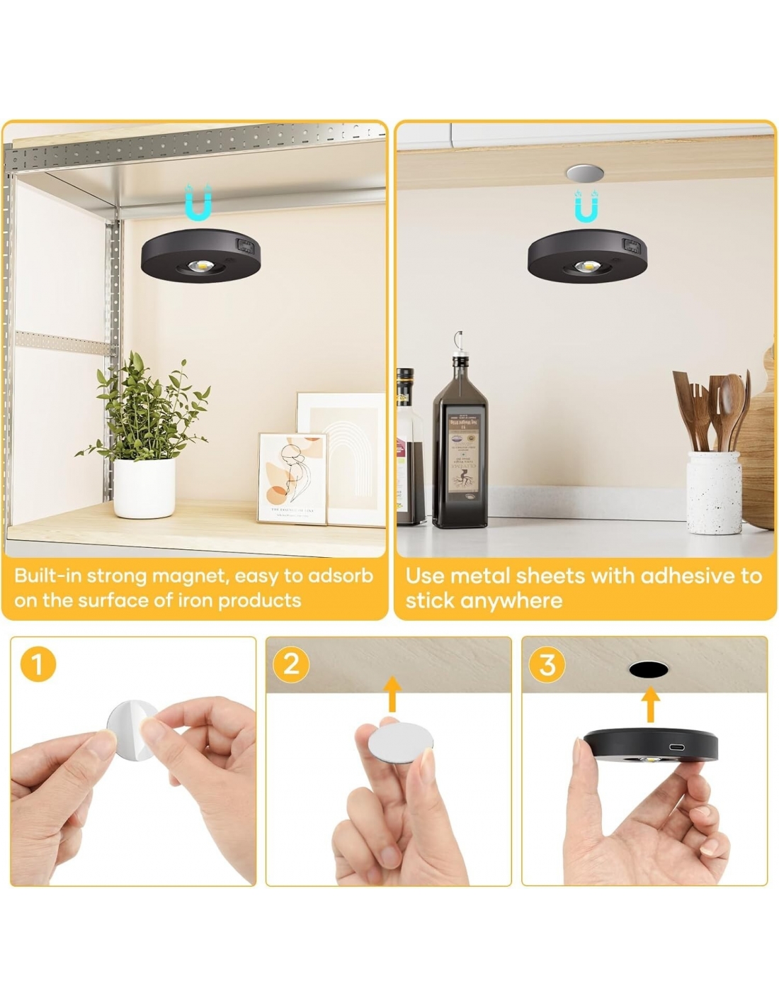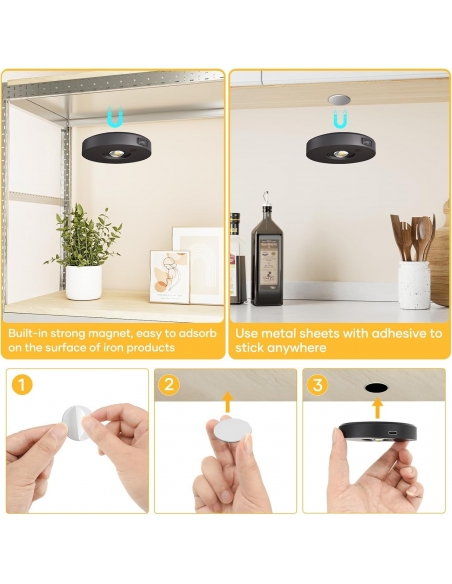 - Super luminosità e impostazione timer: la nostra illuminazione wireless per armadi è realizzata in materiale ABS di alta qualità, è liscia al tatto, dissipa rapidamente il calore, non si corrode facilmente, fornisce un'illuminazione brillante e uniforme, protegge gli occhi. L'illuminazione per armadi a batteria ha una funzione timer. È possibile impostare facilmente lo spegnimento automatico della luce dopo 10, 30, 60 o 120 minuti.