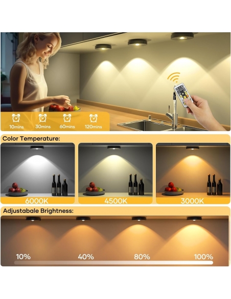 - 3 temperature di colore regolabili: la luce LED sottopensile irradia in 3 temperature di colore: giallo caldo (3000 K), bianco caldo (4500 K) e bianco freddo (6000 K). Può emettere un bellissimo arco, l'illuminazione wireless per vetrine ha 4 livelli di luminosità (10%, 40%, 80%, 100%), facilmente regolabili tramite telecomando. Regola la temperatura di colore in base al tuo umore e goditi la migliore esperienza di illuminazione.