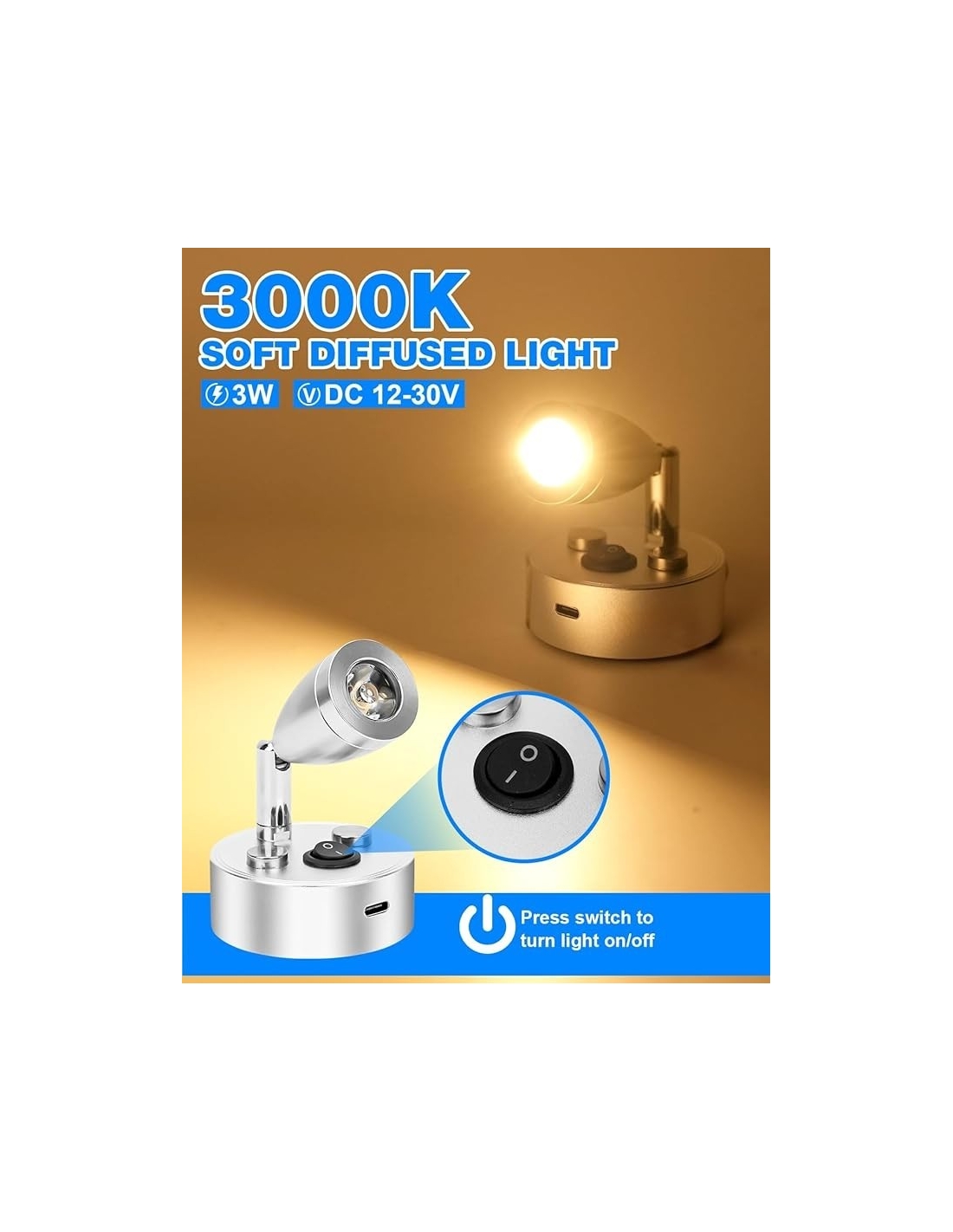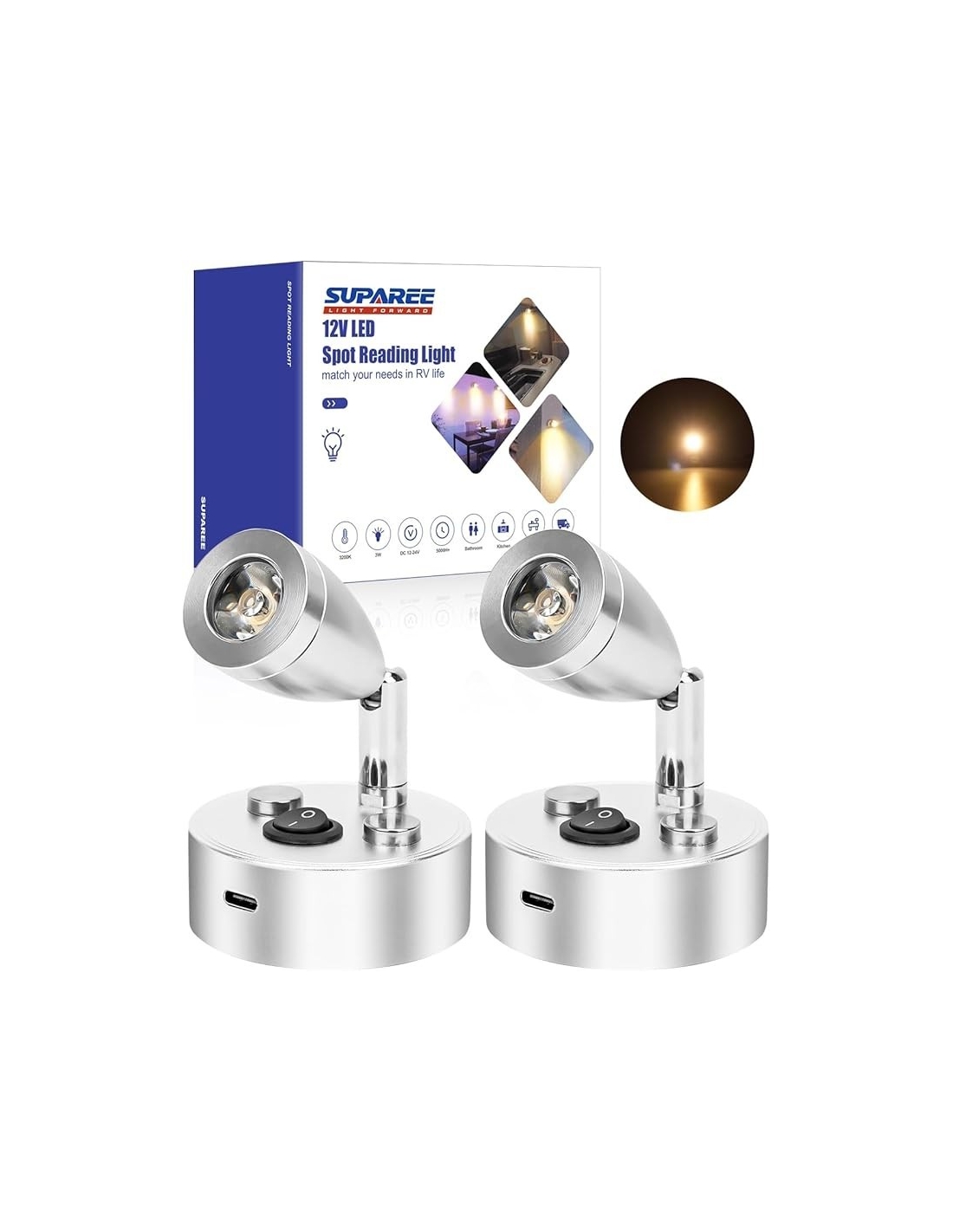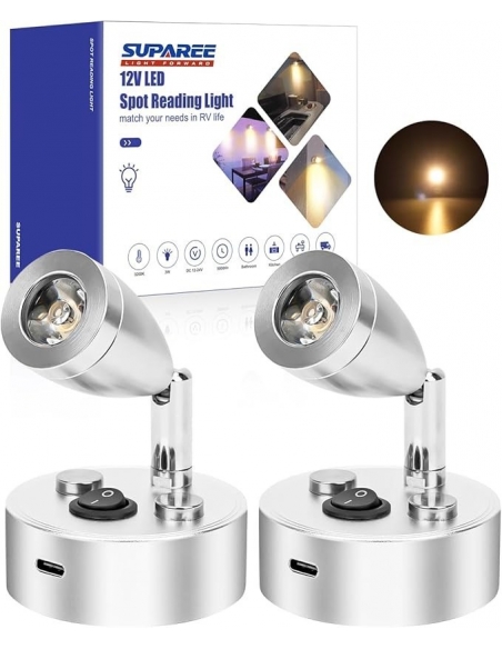 SUPAREE 12V LED Light Campervan USB 12V LED Luce di lettura Camper Van Luci LED interne 12V 3000K con interruttore A-ON/OFF e porta di tipo C per roulotte, camper, barca 2 pezzi