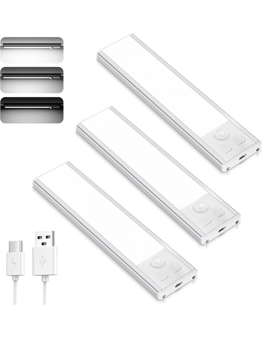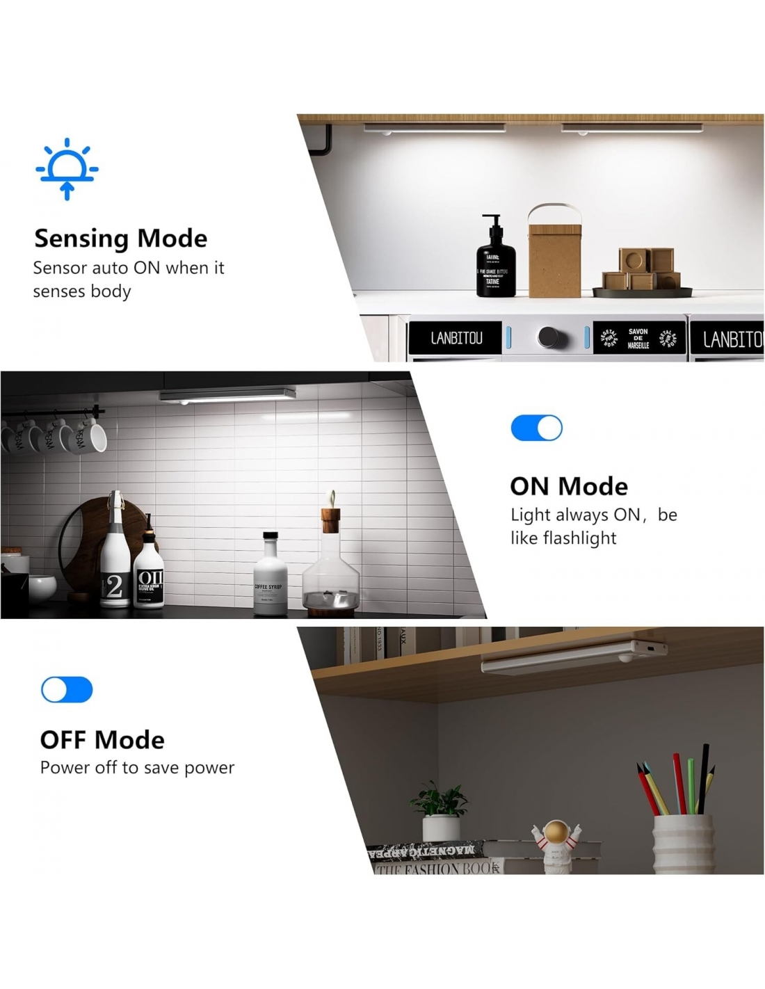 - Luce armadio led con sensore ha 3 modalità di funzionamento: Modalità sempre accesa, Modalità sensore automatico e Modalità spenta. Quando la luce led sottopensile è impostata sulla modalità sensore automatico, si accende immediatamente quando rileva il movimento di un oggetto entro 3 metri/100°; quando la luce led sottopensile non rileva alcun movimento entro 15 secondi, si spegne, a risparmio energetico