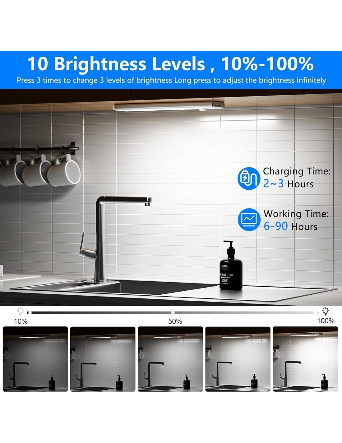 - La luce led sottopensile ha 22 LED e uno spessore di soli 0,9 cm. La led armadio può anche raggiungere un'impostazione di luminosità continua dal 10% al 100%, per soddisfare tutte le vostre esigenze. L'illuminazione del mobile è priva di abbagliamento e la luce è molto morbida e luminosa, protegge gli occhi