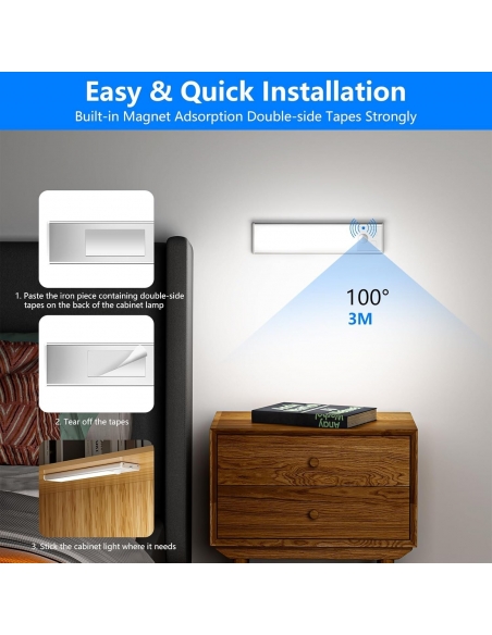 - Questa luce armadio led con sensore è progettata con magneti incorporati, può essere attaccata alla superficie di qualsiasi oggetto in ferro come frigoriferi, porte in ferro, scaffali in ferro ecc. ② Viene fornito con nano strisce. È possibile attaccare le luce armadio led con sensore ovunque si desideri. L'adesivo nano è più resistente, non cade e non lascia segni