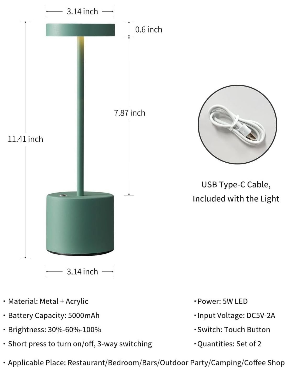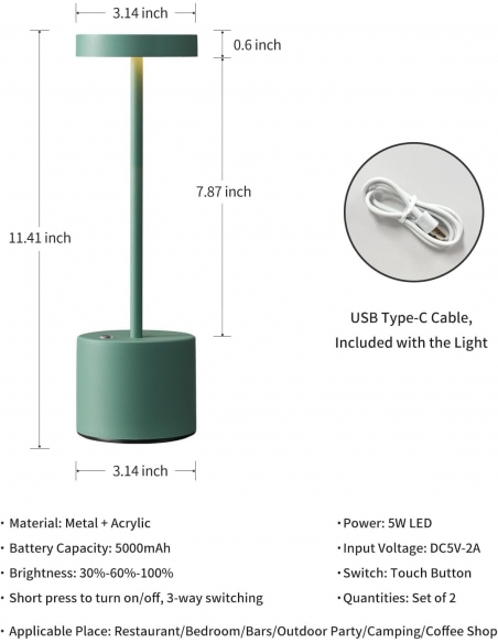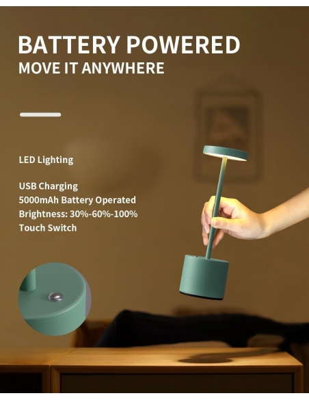 - Stile moderno e minimalista: caratterizzata da un design elegante e moderno con una sofisticata finitura verde laccato, la lampada si adatta a qualsiasi stile di arredamento, aggiungendo un tocco di eleganza. Combinando design minimalista, praticità wireless e funzionalità salvaspazio, questa lampada da tavolo ricaricabile a LED offre una soluzione di illuminazione versatile per spazi limitati.