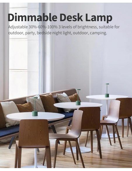 - 3 livelli di luminosità: goditi una luminosità dimmerabile dal 30% al 60% al 100%. Passa da una modalità all'altra con un semplice tocco. Puoi regolare facilmente la luminosità delle lampade da tavolo per adattarla alle tue esigenze in diverse situazioni di illuminazione, come campeggio, lettura, pranzo, ecc.