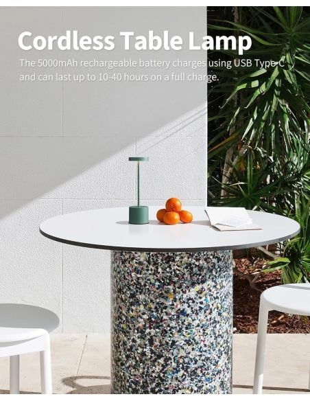 - Lampada da tavolo a LED ricaricabile: dotata di una batteria ricaricabile integrata da 5000 mAh, la lampada può illuminare dalle 8 alle 40 ore con una singola carica. La lampada da tavolo ricaricabile si ricarica completamente utilizzando un cavo USB Type-C in sole 6 ore, rendendola la lampada da scrivania a LED portatile ideale.
